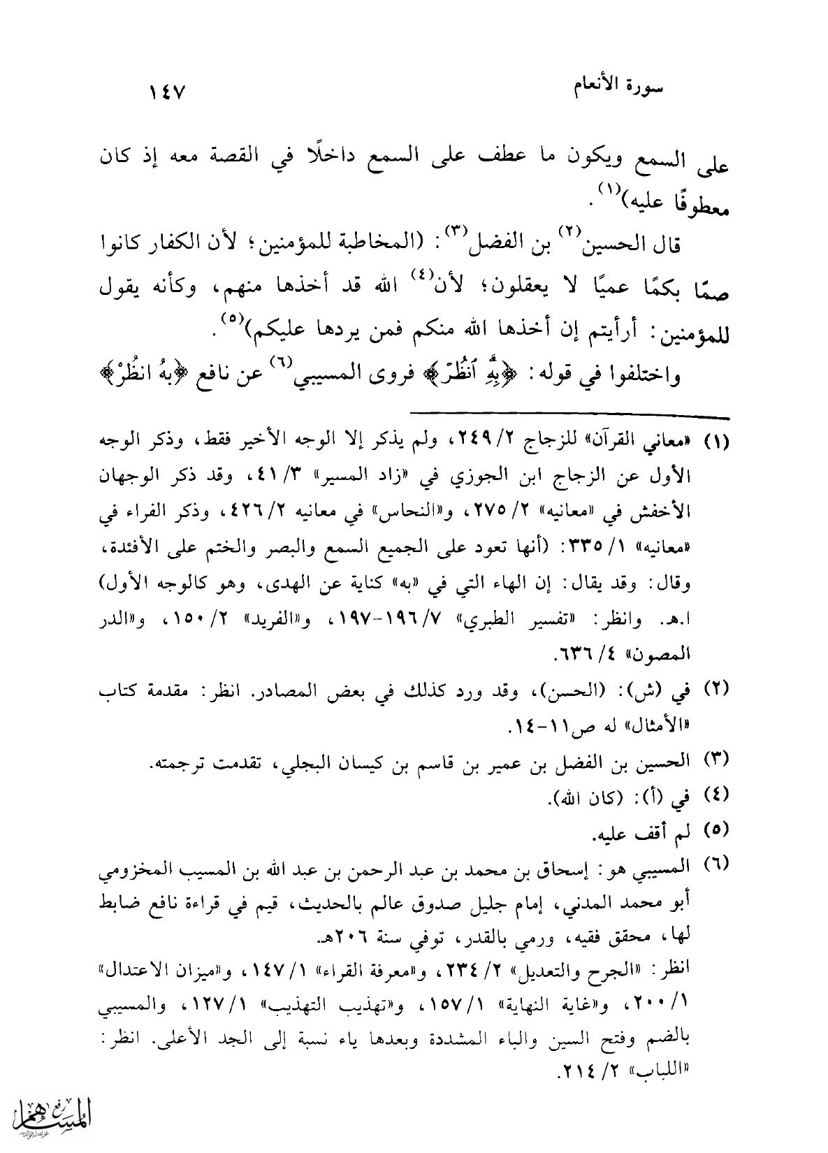 (¬1) "معاني القرآن" للزجاج 2/ 249، ولم يذكر إلا الوجه الأخير فقط، وذكر الوجه الأول عن الزجاج ابن الجوزي في "زاد المسير" 3/ 41، وقد ذكر الوجهان الاْخفش في "معانيه" 2/ 275، و"النحاس" في معانيه 2/ 426، وذكر الفراء في "معانيه" 1/ 335: (أنها تعود على الجميع السمع والبصر والختم على الأفئدة، وقال: وقد يقال: إن الهاء التي في "به" كناية عن الهدى، وهو كالوجه الأول) ا. هـ. وانظر: "تفسير الطبري" 7/ 196 - 197، و"الفريد" 2/ 150، و"الدر المصون" 4/ 636.