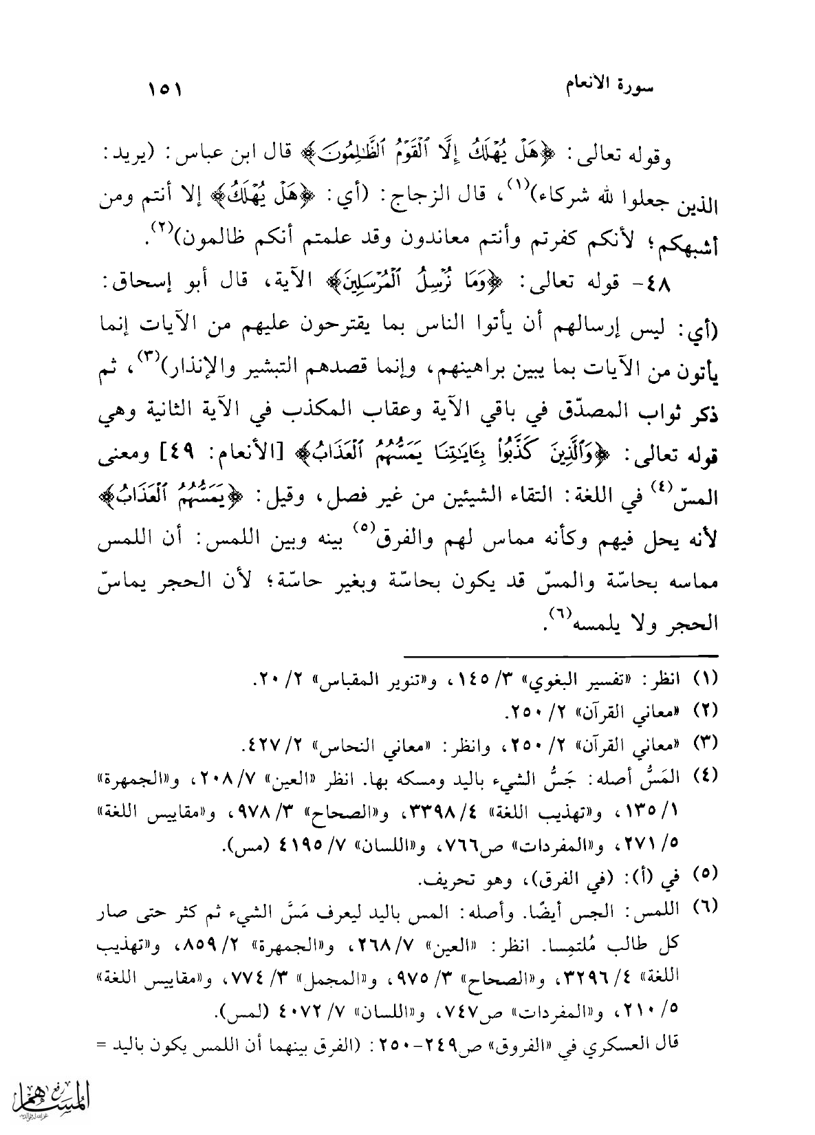 48 - قوله تعالى: {وَمَا نُرْسِلُ الْمُرْسَلِينَ} الآية، قال أبو إسحاق: (أي: ليس إرسالهم أن يأتوا الناس بما يقترحون عليهم من الآيات إنما يأتون من الآيات بما يبين براهينهم، وإنما قصدهم التبشير والإنذار) (¬3)، ثم ذكر ثواب المصدّق في باقي الآية وعقاب المكذب في الآية الثانية وهي قوله تعالى: {وَالَّذِينَ كَذَّبُوا بِآيَاتِنَا يَمَسُّهُمُ الْعَذَابُ} [الأنعام: 49] ومعنى المسّ (¬4) في اللغة: التقاء الشيئين من غير فصل، وقيل: {يَمَسُّهُمُ الْعَذَابُ} لأنه يحل فيهم وكأنه مماس لهم والفرق (¬5) بينه وبين اللمس: أن اللمس مماسه بحاسّة والمسّ قد يكون بحاسّة وبغير حاسّة؛ لأن الحجر يماسّ الحجر ولا يلمسه (¬6).