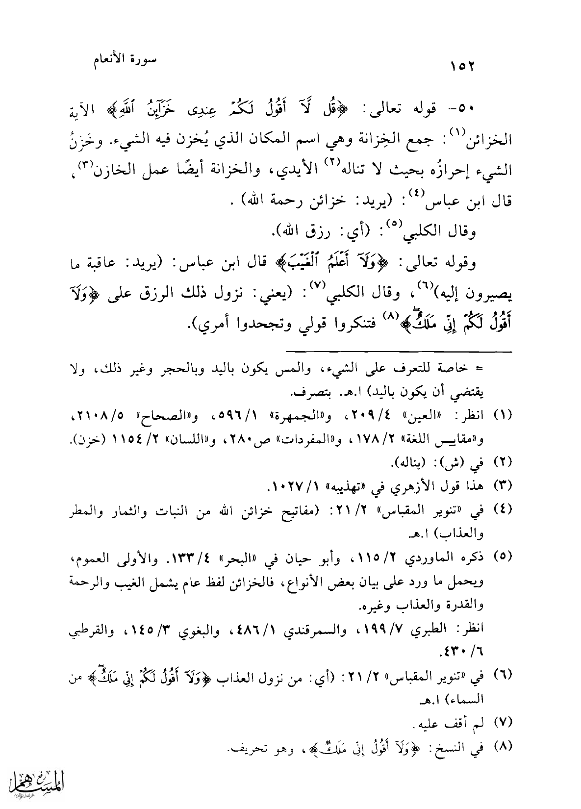 50 - قوله تعالى: {قُلْ لَا أَقُولُ لَكُمْ عِنْدِي خَزَائِنُ اللَّهِ} الآية الخزائن (¬1): جمع الخِزانة وهي اسم المكان الذي يُخزن فيه الشيء. وخَزَنُ الشيء إحرازُه بحيث لا تناله (¬2) الأيدي، والخزانة أيضًا عمل الخازن (¬3)، قال ابن عباس (¬4): (يريد: خزائن رحمة الله).