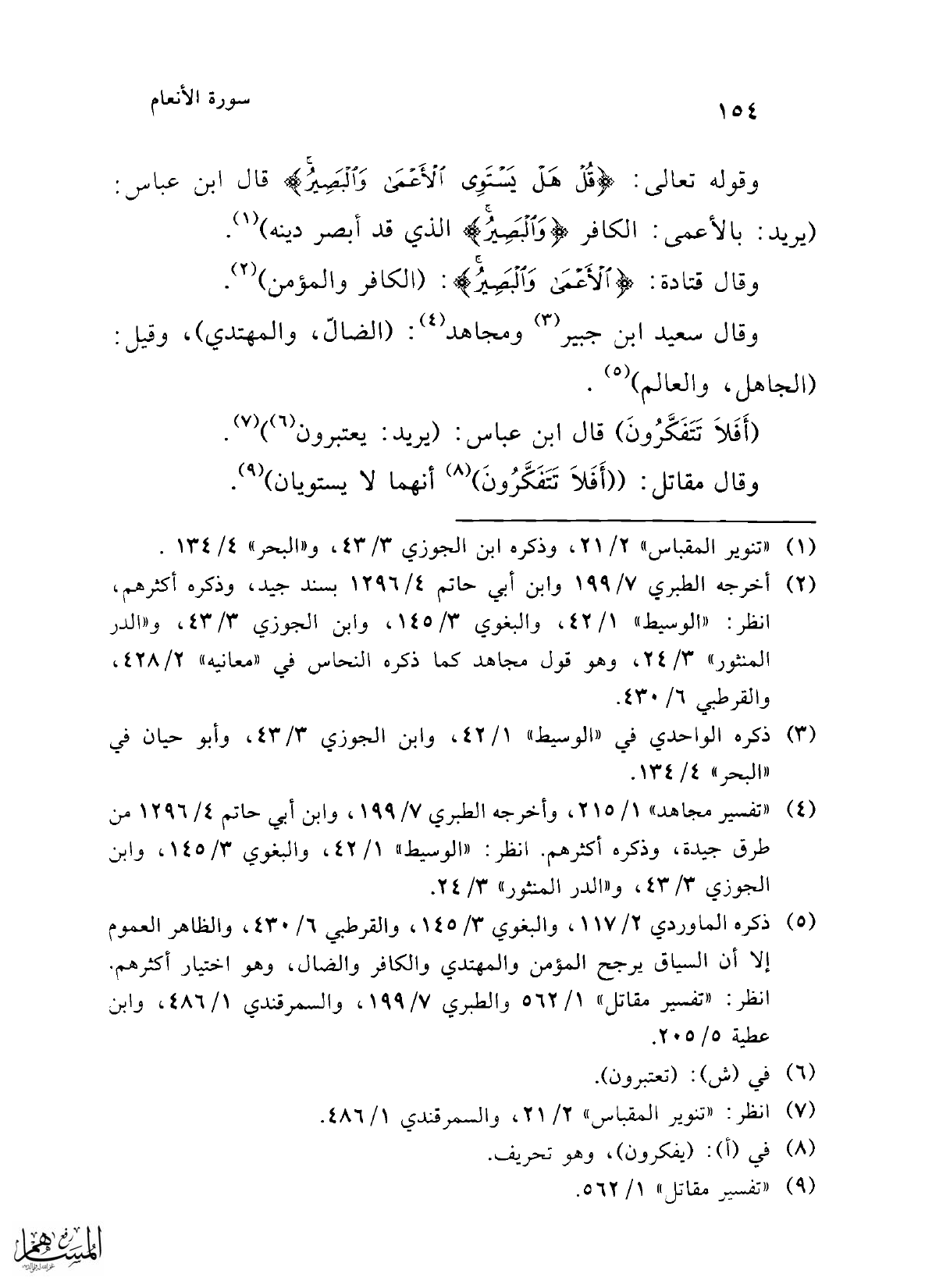 وقوله تعالى: {قُلْ هَلْ يَسْتَوِي الْأَعْمَى وَالْبَصِيرُ} قال ابن عباس: يريد: بالأعمى: الكافر {وَالْبَصِيرُ} الذي قد أبصر دينه) (¬1).