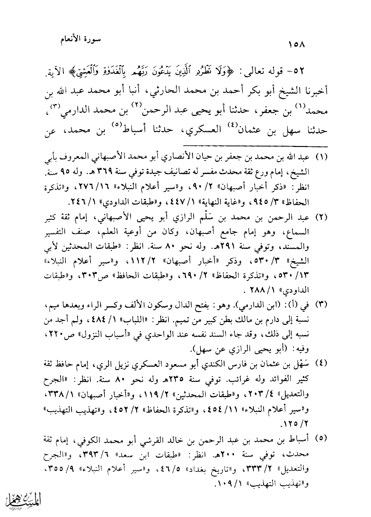 52 - قوله تعالى: {وَلَا تَطْرُدِ الَّذِينَ يَدْعُونَ رَبَّهُمْ بِالْغَدَاةِ وَالْعَشِيِّ} الآية. أخبرنا الشيخ أبو بكر أحمد بن محمد الحارثي، أنبأ أبو محمد عبد الله بن محمد (¬1) بن جعفر، حدثنا أبو يحيى عبد الرحمن (¬2) بن محمد الدارمي (¬3)، حدثنا سهل بن عثمان (¬4) العسكري، حدثنا أسباط (¬5) بن محمَّد، عن