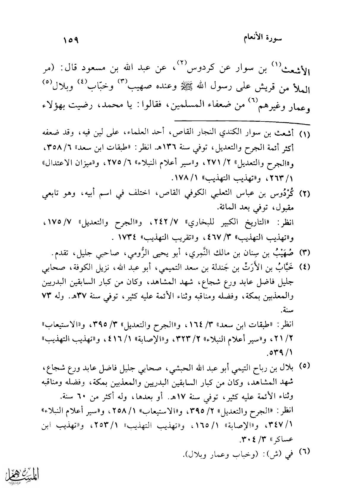 الأشعث (¬1) بن سوار عن كردوس (¬2)، عن عبد الله بن مسعود قال: (مر الملأ من قريش على رسول الله - صلى الله عليه وسلم - وعنده صهيب (¬3) وخبّاب (¬4) وبلال (¬5) وعمار وغيرهم (¬6) من ضعفاء المسلمين، فقالوا: يا محمد، رضيت بهؤلاء