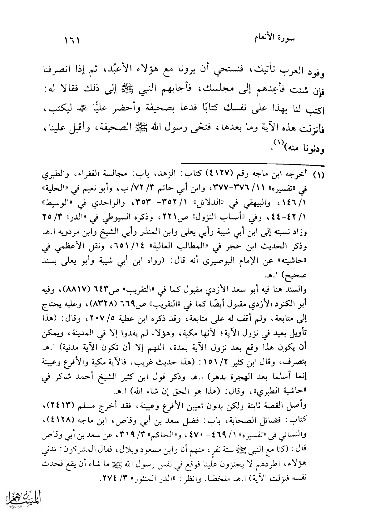 (¬1) أخرج ابن ماجه رقم (4127) كتاب: الزهد، باب: مجالسة الفقراء، والطبري في "تفسيره" 11/ 376 - 377، وابن أبي حاتم 3/ 72/ ب، وأبو نعيم في "الحلية" 1/ 146، والبيهقي في "الدلائل" 1/ 352 - 353، والواحدي في "الوسيط" 1/ 42 - 44، وفي "أسباب النزول" ص 221، وذكره السيوطي في "الدر" 3/ 25 وزاد نسبته إلى ابن أبي شيبة وأبي يعلى وابن المنذر وأبي الشيخ وابن مردويه ا. هـ. وذكر الحديث ابن حجر في "المطالب العالية" 14/ 651، ونقل الأعظمي في "حاشيته" عن الإمام البوصيري أنه قال: (رواه ابن أبي شيبة وأبو يعلى بسند صحيح) ا. هـ.