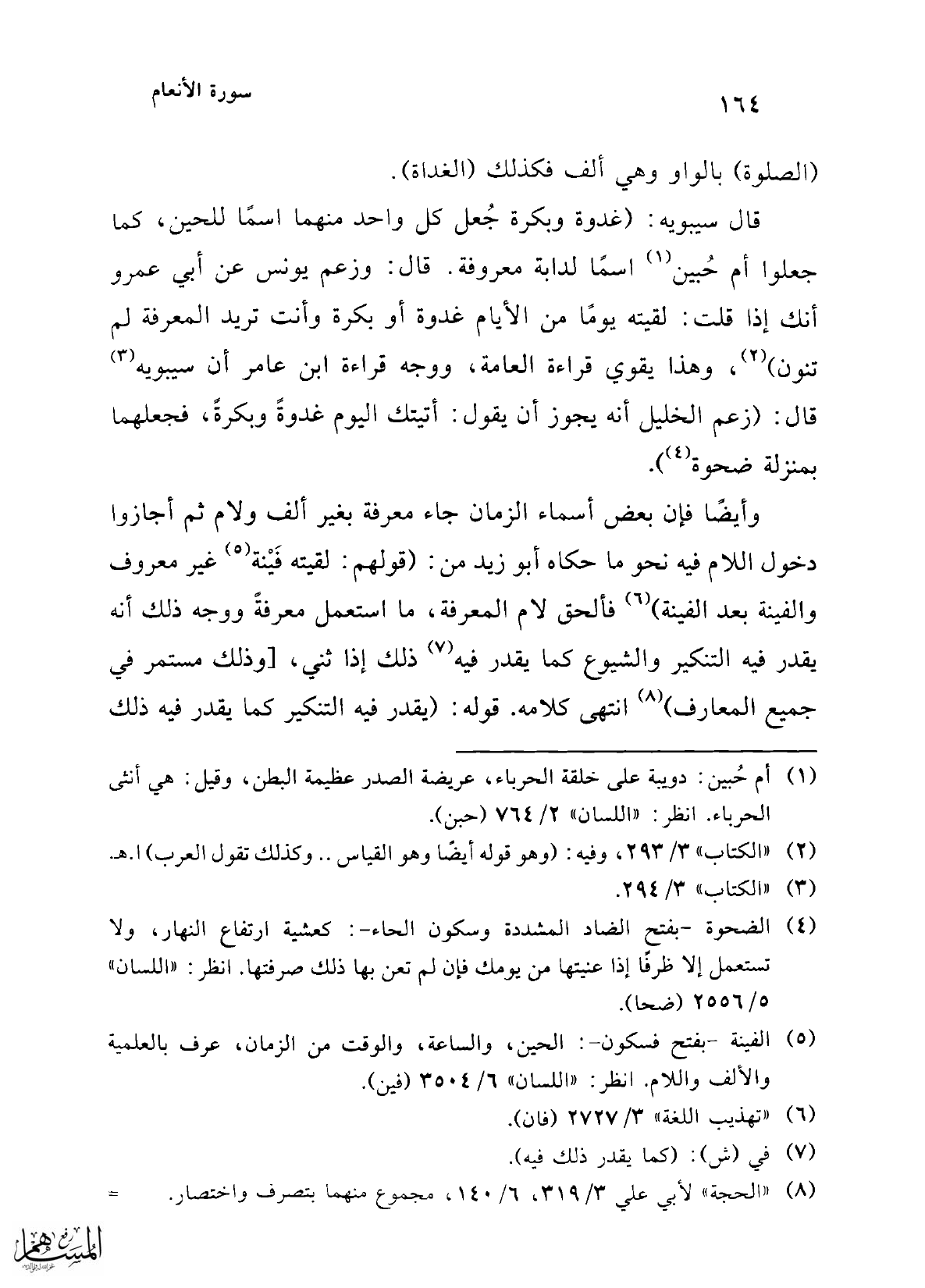 قال سيبويه: (غدوة وبكرة جُعل كل واحد منهما اسمًا للحين، كما جعلوا أم حُبين (¬1) اسما لدابة معروفة. قال: وزعم يونس عن أبي عمرو أنك إذا قلت: لقيته يومًا من الأيام غدوة أو بكرة وأنت تريد المعرفة لم تنون) (¬2)، وهذا يقوي قراءة العامة، ووجه قراءة ابن عامر أن سيبويه (¬3) قال: (زعم الخليل أنه يجوز أن يقول: أتيتك اليوم غدوةً وبكرةً، فجعلهما بمنزلة ضحوة (¬4)).