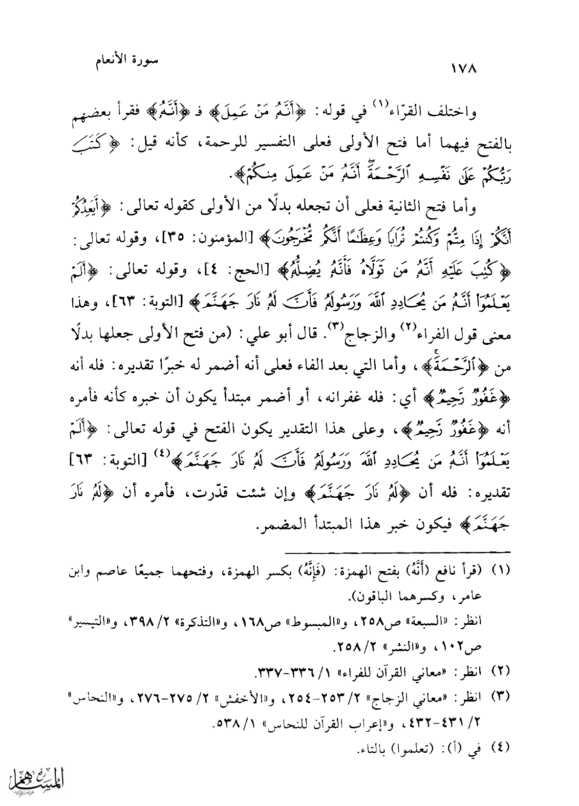 وأما فتح الثانية فعلى أن تجعله بدلاً من الأولى كقوله تعالى: {أَيَعِدُكُمْ أَنَّكُمْ إِذَا مِتُّمْ وَكُنْتُمْ تُرَابًا وَعِظَامًا أَنَّكُمْ مُخْرَجُونَ} [المؤمنون: 35]، وقوله تعالى: {كُتِبَ عَلَيْهِ أَنَّهُ مَنْ تَوَلَّاهُ فَأَنَّهُ يُضِلُّهُ} [الحج: 4]، وقوله تعالى: {أَلَمْ يَعْلَمُوا أَنَّهُ مَنْ يُحَادِدِ اللَّهَ وَرَسُولَهُ فَأَنَّ لَهُ نَارَ جَهَنَّمَ} [التوبة: 63]، وهذا معنى قول الفراء (¬2) والزجاج (¬3). قال أبو علي: (من فتح الأولى جعلها بدلاً من {الرَّحْمَةَ}، وأما التي بعد الفاء فعلى أنه أضمر له خبرًا تقديره: فله أنه {غَفُورٌ رَحِيمٌ} أي: فله غفرانه، أو أضمر مبتدأ يكون أن خبره كأنه فأمره أنه {غَفُورٌ رَحِيمٌ}، وعلى هذا التقدير يكون الفتح في قوله تعالى: {أَلَمْ يَعْلَمُوا أَنَّهُ مَنْ يُحَادِدِ اللَّهَ وَرَسُولَهُ فَأَنَّ لَهُ نَارَ جَهَنَّمَ} (¬4) [التوبة: 63] تقديره: فله أن {لَهُ نَارَ جَهَنَّمَ} وإن شئت قدرت، فأمره أن {لَهُ نَارَ جَهَنَّمَ} فيكون خبر هذا المبتدأ المضمر.