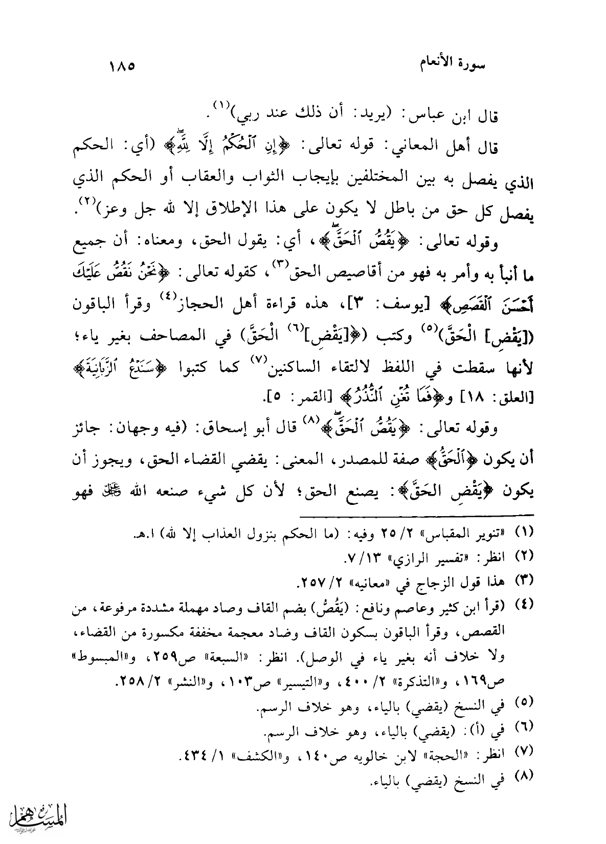 وقوله تعالى: {يَقُصُّ الْحَقَّ}، أي: يقول الحق، ومعناه: أن جميع ما أنبأ به وأمر به فهو من أقاصيص الحق (¬3)، كقوله تعالى: {نَحْنُ نَقُصُّ عَلَيْكَ أَحْسَنَ الْقَصَصِ} [يوسف: 3]، هذه قراءة أهل الحجاز (¬4) وقرأ الباقون ([يَقْضِ] الْحَقَّ) (¬5) وكتب ([يَقْضِ] (¬6) الْحَقَّ) في المصاحف بغير ياء؛ لأنها سقطت في اللفظ لالتقاء الساكنين (¬7) كما كتبوا {سَنَدْعُ الزَّبَانِيَةَ (18)} [العلق: 18] و {فَمَا تُغْنِ النُّذُرُ} [القمر: 5].