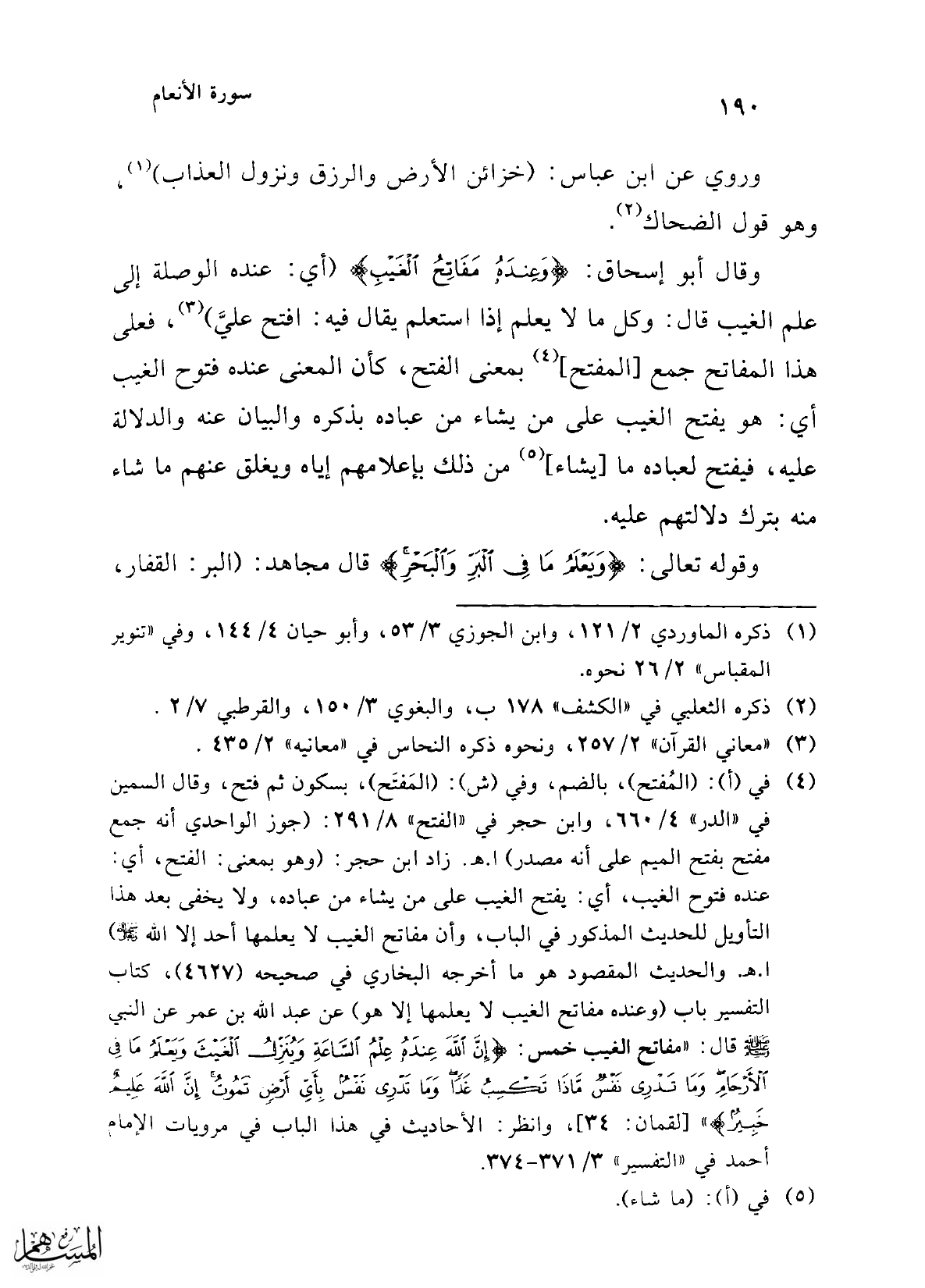 (¬4) في (أ): (المُفتح)، بالضم، وفي (ش): (المَفتَح)، بسكون ثم فتح، وقال السمين في "الدر" 4/ 660، وابن حجر في "الفتح" 8/ 291: (جوز الواحدي أنه جمع مفتح بفتح الميم على أنه مصدر) ا. هـ. زاد ابن حجر: (وهو بمعنى: الفتح، أي: عنده فتوح الغيب، أي: يفتح الغيب على من يشاء من عباده، ولا يخفى بعد هذا التأويل للحديث المذكور في الباب، وأن مفاتح الغيب لا يعلمها أحد إلا الله سبحانه وتعالى) ا. هـ والحديث المقصود هو ما أخرجه البخاري في صحيحه (4627)، كتاب التفسير باب (وعنده مفاتح الغيب لا يعلمها إلا هو) عن عبد الله بن عمر عن النبي - صلى الله عليه وسلم - قال: "مفاتح الغيب خمس: {إِنَّ اللَّهَ عِنْدَهُ عِلْمُ السَّاعَةِ وَيُنَزِّلُ الْغَيْثَ وَيَعْلَمُ مَا فِي الْأَرْحَامِ وَمَا تَدْرِي نَفْسٌ مَاذَا تَكْسِبُ غَدًا وَمَا تَدْرِي نَفْسٌ بِأَيِّ أَرْضٍ تَمُوتُ إِنَّ اللَّهَ عَلِيمٌ خَبِيرٌ} [لقمان: 34]، وانظر: الأحاديث في هذا الباب في مرويات الإمام أحمد في "التفسير" 3/ 371 - 374.