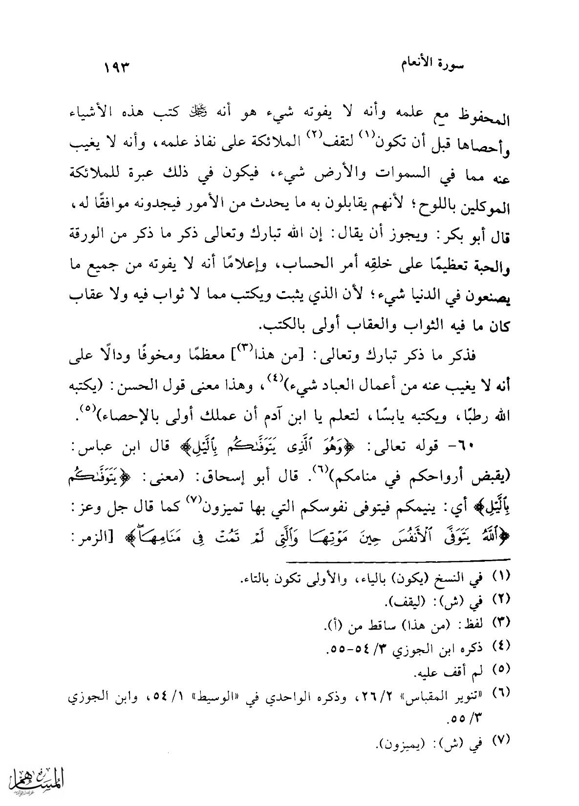 60 - قوله تعالى: {وَهُوَ الَّذِي يَتَوَفَّاكُمْ بِاللَّيْلِ} قال ابن عباس: (يقبض أرواحكم في منامكم) (¬6). قال أبو إسحاق: (معنى: {يَتَوَفَّاكُمْ بِاللَّيْلِ} أي: ينيمكم فيتوفى نفوسكم التي بها تميزون (¬7) كما قال جل وعز: {اللَّهُ يَتَوَفَّى الْأَنْفُسَ حِينَ مَوْتِهَا وَالَّتِي لَمْ تَمُتْ فِي مَنَامِهَا} [الزمر: