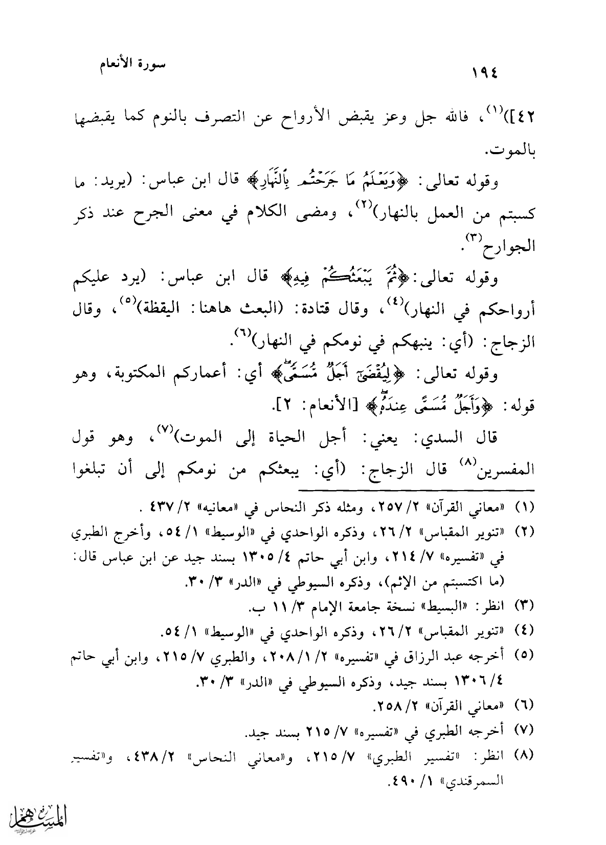 (¬8) انظر: "تفسير الطبري" 7/ 215، و"معاني النحاس" 2/ 438، و"تفسير السمرقندي" 1/ 490.