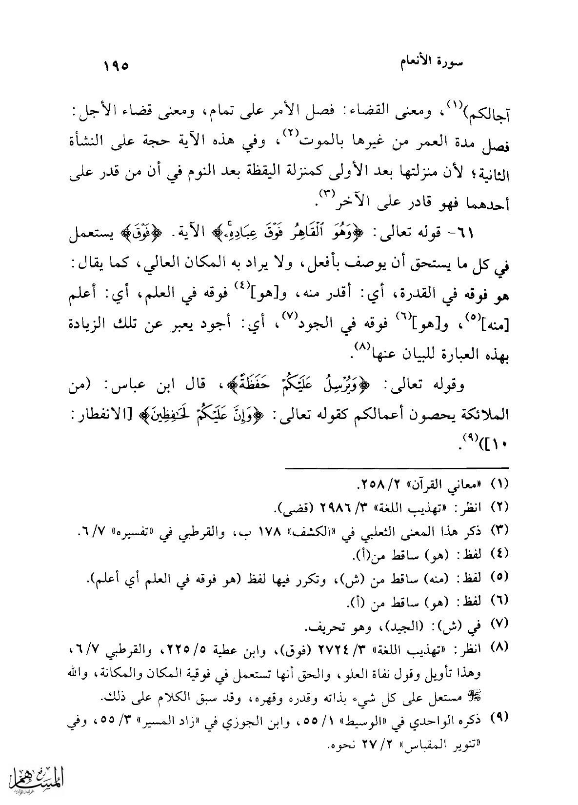 61 - قوله تعالى: {وَهُوَ الْقَاهِرُ فَوْقَ عِبَادِهِ} الآية. {فَوْقَ} يستعمل في كل ما يستحق أن يوصف بأفعل، ولا يراد به المكان العالي، كما يقال: هو فوقه في القدرة، أي: أقدر منه، و [هو] (¬4) فوقه في العلم، أي: أعلم [منه] (¬5)، و [هو] (¬6) فوقه في الجود (¬7)، أي: أجود يعبر عن تلك الزيادة بهذه العبارة للبيان عنها (¬8).
