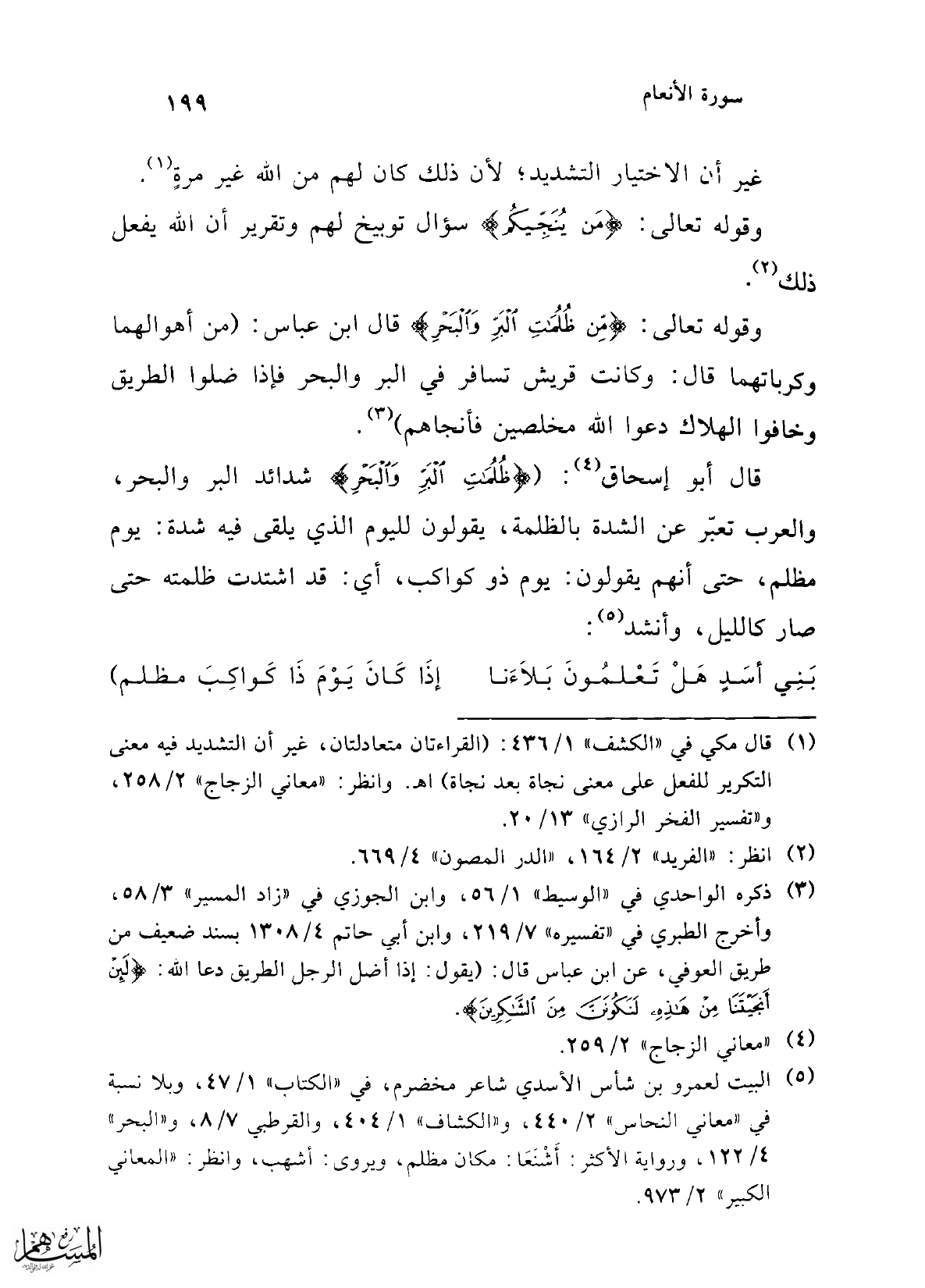 وقوله تعالى: {مَنْ يُنَجِّيكُمْ} سؤال توبيخ لهم وتقرير أن الله يفعل ذلك (¬2). وقوله تعالى: {مِنْ ظُلُمَاتِ الْبَرِّ وَالْبَحْرِ} قال ابن عباس: (من أهوالهما وكرباتهما قال: وكانت قريش تسافر في البر والبحر فإذا ضلوا الطريق وخافوا الهلاك دعوا الله مخلصين فأنجاهم) (¬3). قال أبو إسحاق (¬4): ({ظُلُمَاتِ الْبَرِّ وَالْبَحْرِ} شدائد البر والبحر، والعرب تعبر عن الشدة بالظلمة، يقولون لليوم الذي يلقى فيه شدة: يوم مظلم، حتى أنهم يقولون: يوم ذو كواكب، أي: قد اشتدت ظلمته حتى صار كالليل، وأنشد (¬5):