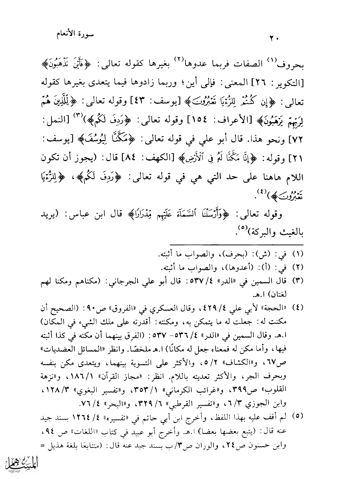 بحروف (¬1) الصفات فربما عدوها (¬2) بغيرها كقوله تعالى: {فَأَيْنَ تَذْهَبُونَ} [التكوير: 26] المعنى: فإلى أين؛ وربما زادوها فيما يتعدى بغيرها كقوله تعالى: {إِنْ كُنْتُمْ لِلرُّؤْيَا تَعْبُرُونَ} [يوسف: 43] وقوله تعالى: {لِلَّذِينَ هُمْ لِرَبِّهِمْ يَرْهَبُونَ} [الأعراف: 154] وقوله تعالى: {رَدِفَ لَكُمْ} (¬3) [النمل: 72] ونحو هذا. قال أبو علي في قوله تعالى: {مَكَّنَّا لِيُوسُفَ} [يوسف: 21] وقوله: {إِنَّا مَكَّنَّا لَهُ فِي الْأَرْضِ} [الكهف: 84] قال: (يجوز أن تكون اللام هاهنا على حد التي هي في قوله تعالى: {رَدِفَ لَكُمْ}، {لِلرُّؤْيَا تَعْبُرُونَ}) (¬4).