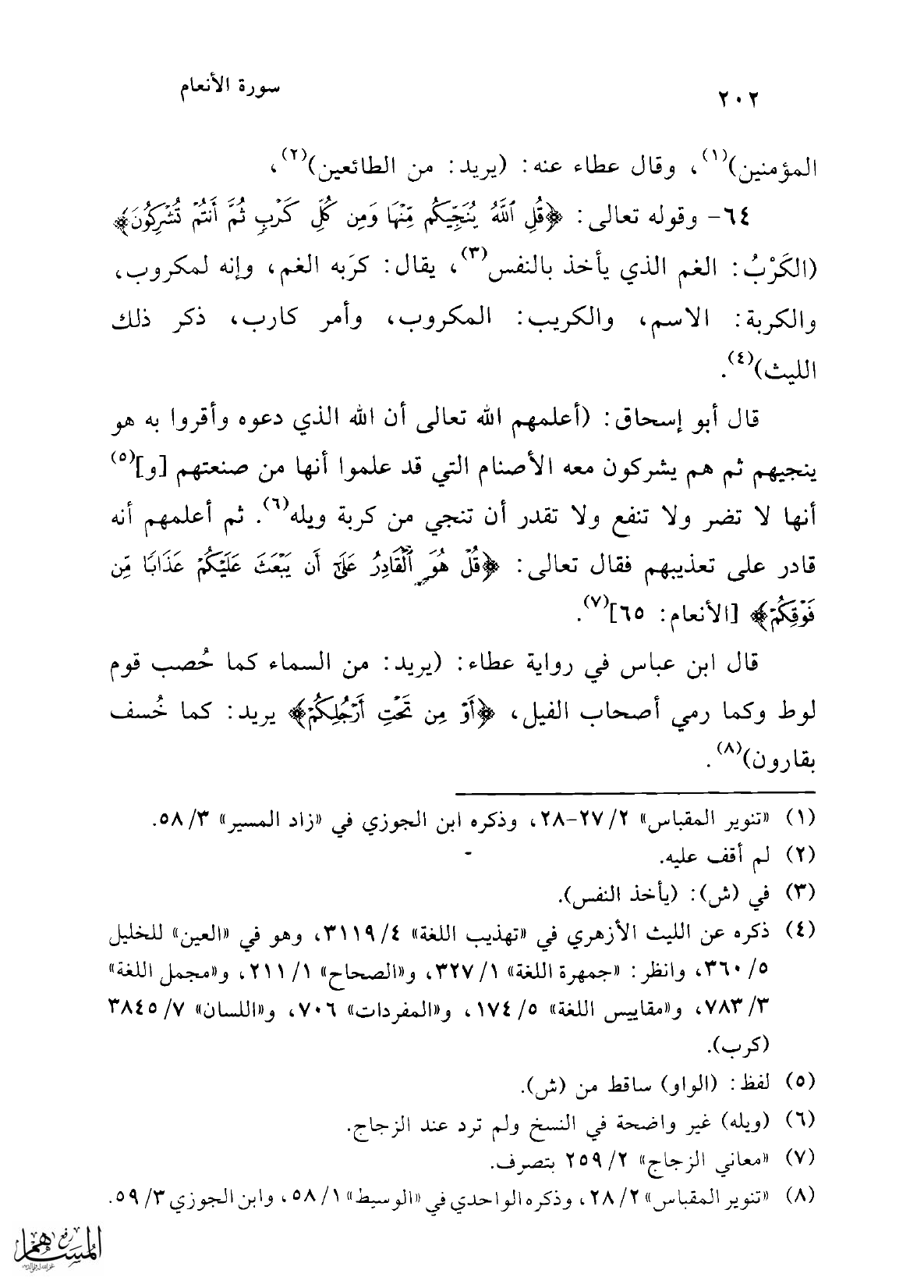 64 - وقوله تعالى: {قُلِ اللَّهُ يُنَجِّيكُمْ مِنْهَا وَمِنْ كُلِّ كَرْبٍ ثُمَّ أَنْتُمْ تُشْرِكُونَ} (الكَرْبُ: الغم الذي يأخذ بالنفس (¬3)، يقال: كرَبه الغم، وإنه لمكروب، والكربة: الاسم، والكريب: المكروب، وأمر كارب، ذكر ذلك الليث) (¬4).