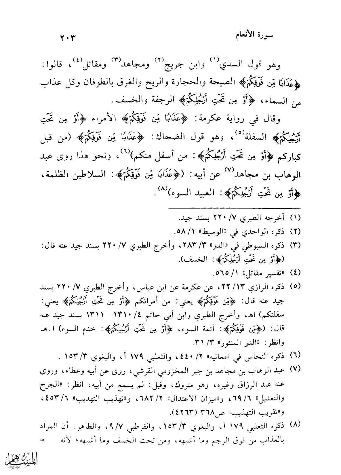 (¬5) ذكره الرازي 13/ 22، عن عكرمة عن ابن عباس، وأخرج الطبري 7/ 220 بسند جيد عنه قال: {مِنْ فَوْقِكُمْ} يعني: من أمرائكم {أَوْ مِنْ تَحْتِ أَرْجُلِكُمْ} يعني: سفلتكم) اهـ، وأخرج الطبري وابن أبي حاتم 4/ 1310 - 1311 بسند جيد عنه قال: ({مِنْ فَوْقِكُمْ}: أئمة السوء، {أَوْ مِنْ تَحْتِ أَرْجُلِكُمْ}: خدم السوء) ا. هـ. وانظر: "الدر المنثور" 3/ 31.