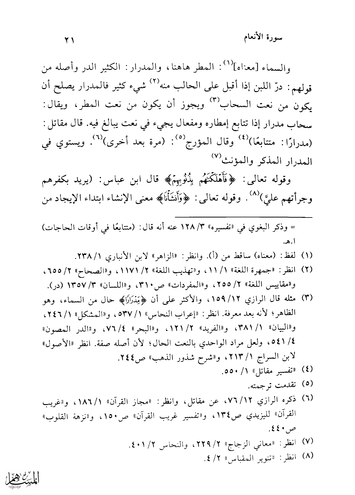 والسماء [معناه] (¬1): المطر هاهنا، والمدرار: الكثير الدر وأصله من قولهم: درّ اللبن إذا أقبل على الحالب منه (¬2) شيء كثير فالمدرار يصلح أن يكون من نعت السحاب (¬3) ويجوز أن يكون من نعت المطر، ويقال: سحاب مدرار إذا تتابع إمطاره ومفعال يجيء في نعت يبالغ فيه. قال مقاتل: (مدرارًا: متتابعًا) (¬4) وقال المؤرج (¬5): (مرة بعد أخرى) (¬6). ويستوي في المدرار المذكر والمؤنث (¬7)
