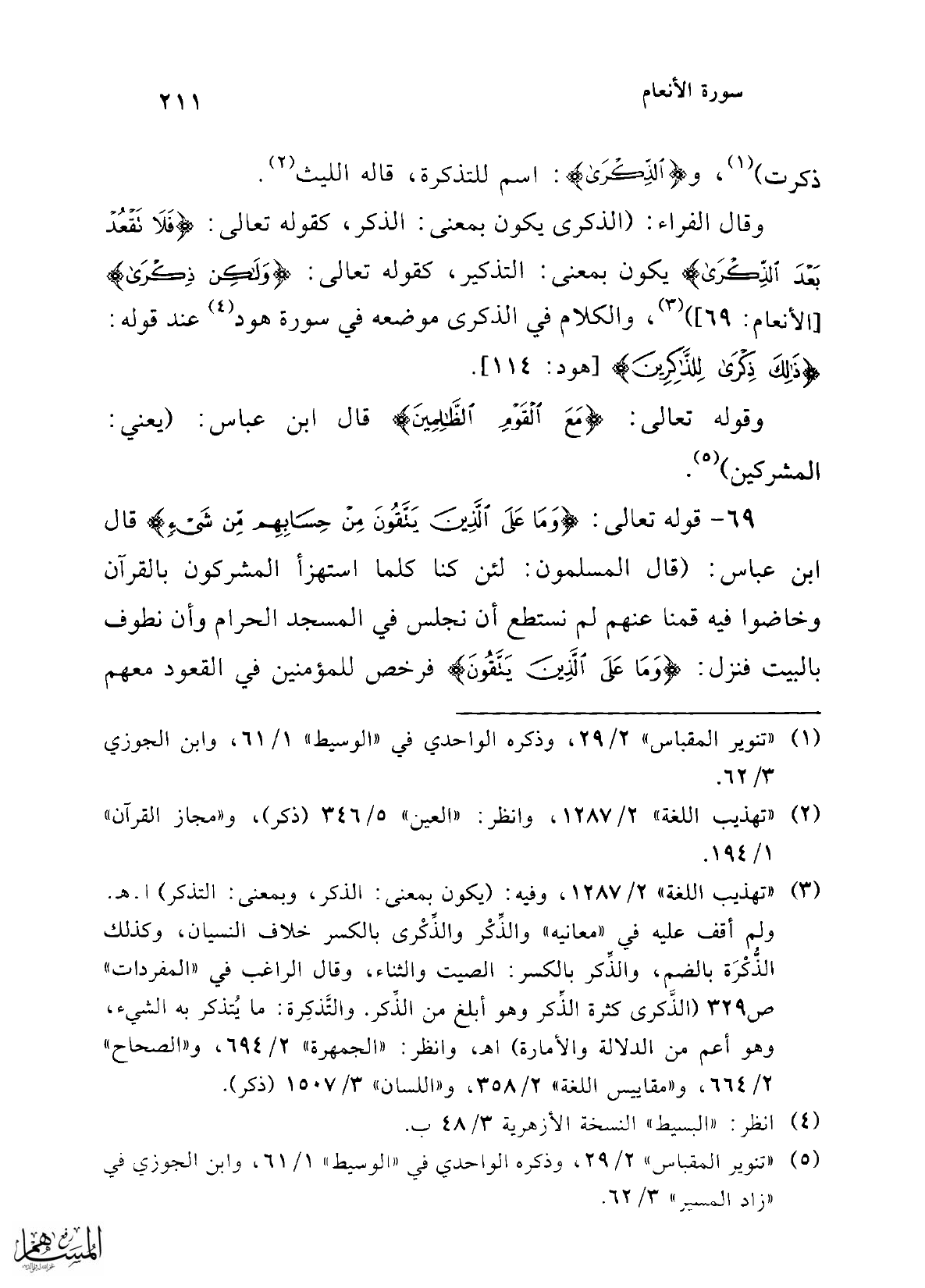 (¬5) "تنوير المقباس" 2/ 29 ,وذكره الواحدي في "الوسيط" 1/ 61، وابن الجوزي في "زاد المسير" 3/ 62.