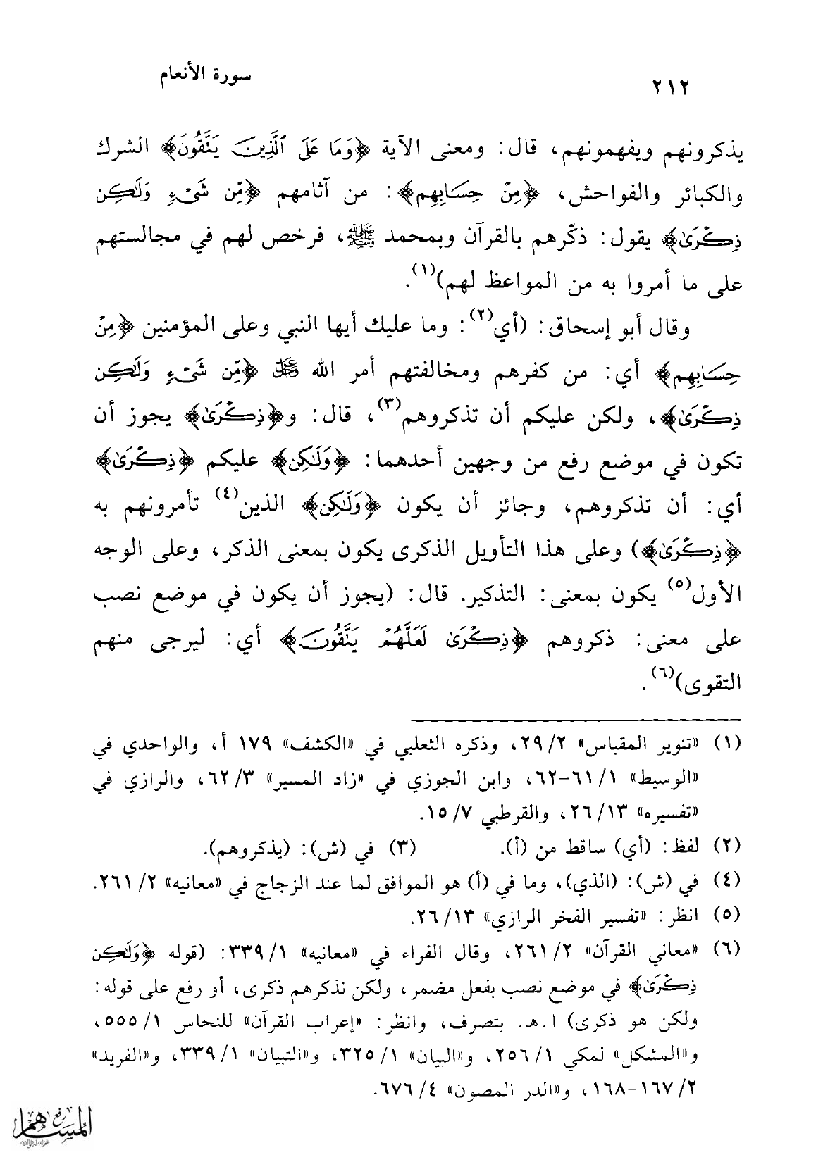 وقال أبو إسحاق: (أي (¬2): وما عليك أيها النبي وعلى المؤمنين {مِنْ حِسَابِهِمْ} أي: من كفرهم ومخالفتهم أمر الله عز وجل {مِنْ شَيْءٍ وَلَكِنْ ذِكْرَى}، ولكن عليكم أن تذكروهم (¬3)، قال: و {ذِكْرَى} يجوز أن تكون في موضع رفع من وجهين أحدهما: {وَلَكِنْ} عليكم {ذِكْرَى} أي: أن تذكروهم، وجائز أن يكون {وَلَكِنْ} الذين (¬4) تأمرونهم به {ذِكْرَى}) وعلى هذا التأويل الذكرى يكون بمعنى الذكر، وعلى الوجه الأول (¬5) يكون بمعنى: التذكير. قال: (يجوز أن يكون في موضع نصب على معنى: ذكروهم {ذِكْرَى لَعَلَّهُمْ يَتَّقُونَ} أي: ليرجى منهم التقوى) (¬6).