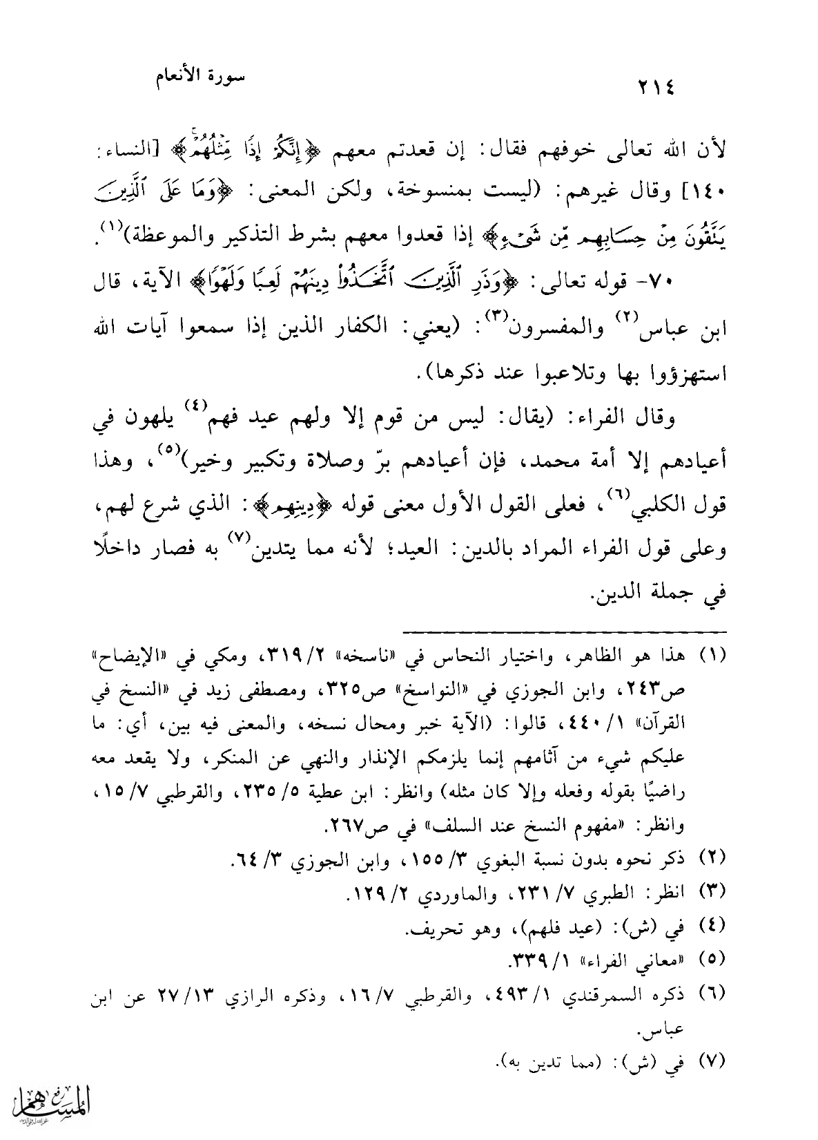 70 - قوله تعالى: {وَذَرِ الَّذِينَ اتَّخَذُوا دِينَهُمْ لَعِبًا وَلَهْوًا} الآية، قال ابن عباس (¬2) والمفسرون (¬3): (يعني: الكفار الذين إذا سمعوا آيات الله استهزؤوا بها وتلاعبوا عند ذكرها).