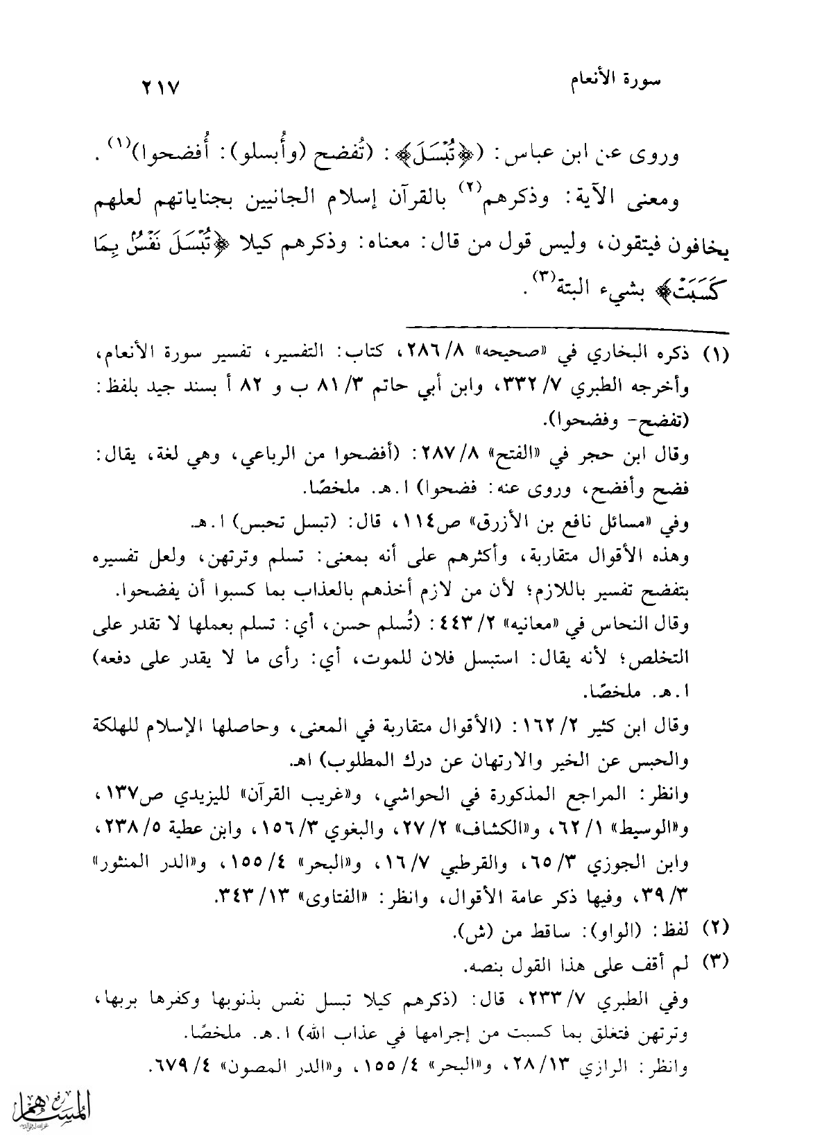 وفي الطبري 7/ 233، قال: (ذكرهم كيلا تبسل نفس بذنوبها وكفرها بربها، وترتهن فتغلق بما كسبت من إجرامها في عذاب الله) ا. هـ. ملخصًا.