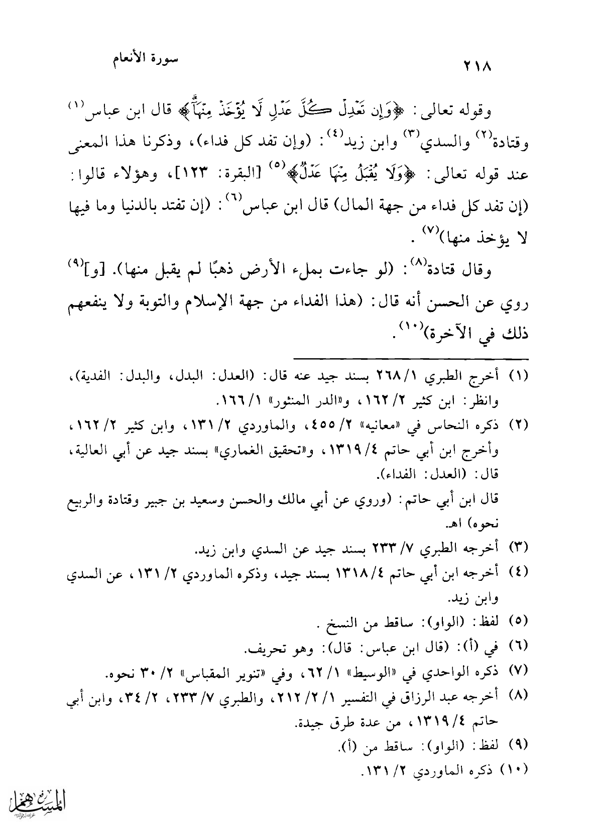 (¬1) أخرج الطبري 1/ 268 بسند جيد عنه قال: (العدل: البدل، والبدل: الفدية)، وانظر: ابن كثير 2/ 162، و"الدر المنثور" 1/ 166.