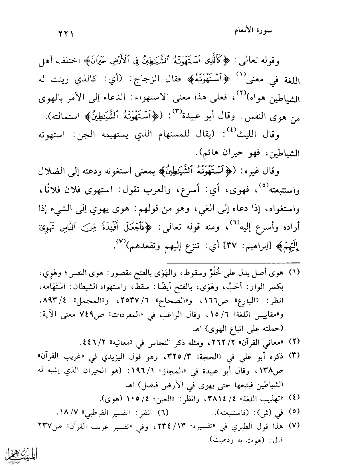وقال غيره: ({اسْتَهْوَتْهُ الشَّيَاطِينُ} بمعنى استغوته ودعته إلى الضلال واستتبعته (¬5)، فهوى، أي: أسرع، والعرب تقول: استهوى فلان فلانًا، واستغواه، إذا دعاه إلى الغي، وهو من قولهم: هوى يهوي إلى الشيء إذا أراده وأسرع إليه (¬6)، ومنه قوله تعالى: {فَاجْعَلْ أَفْئِدَةً مِنَ النَّاسِ تَهْوِي إِلَيْهِمْ} [إبراهيم: 37] أي: تنزع إليهم وتقعدهم) (¬7).