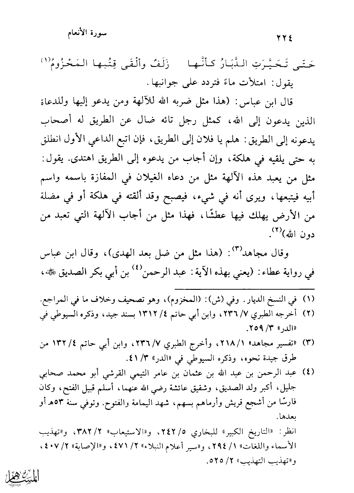 قال ابن عباس: (هذا مثل ضربه الله للآلهة ومن يدعو إليها وللدعاة الذين يدعون إلى الله، كمثل رجل تائه ضال عن الطريق له أصحاب يدعونه إلى الطريق: هلم يا فلان إلى الطريق، فإن أتبع الداعي الأول انطلق به حتى يلقيه في هلكة، وإن أجاب من يدعوه إلى الطريق اهتدى. يقول: مثل من يعبد هذه الآلهة مثل من دعاه الغيلان في المفازة باسمه واسم أبيه فيتبعها، ويرى أنه في شيء، فيصبح وقد ألقته في هلكة أو في مضلة من الأرض يهلك فيها عطشًا، فهذا مثل من أجاب الآلهة التي تعبد من دون الله) (¬2).