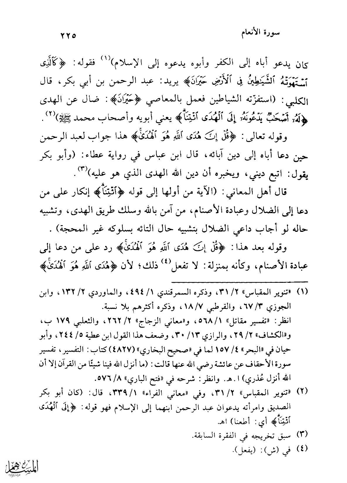 كان يدعو أباه إلى الكفر وأبوه يدعوه إلى الإِسلام) (¬1) فقوله: {كَالَّذِي اسْتَهْوَتْهُ الشَّيَاطِينُ فِي الْأَرْضِ حَيْرَانَ} يريد: عبد الرحمن بن أبي بكر، قال الكلبي: (استفزّته الشياطين فعمل بالمعاصي {حَيْرَانَ}: ضال عن الهدى {لَهُ أَصْحَابٌ يَدْعُونَهُ إِلَى الْهُدَى ائْتِنَا} يعني أبويه وأصحاب محمد - صلى الله عليه وسلم -) (¬2).