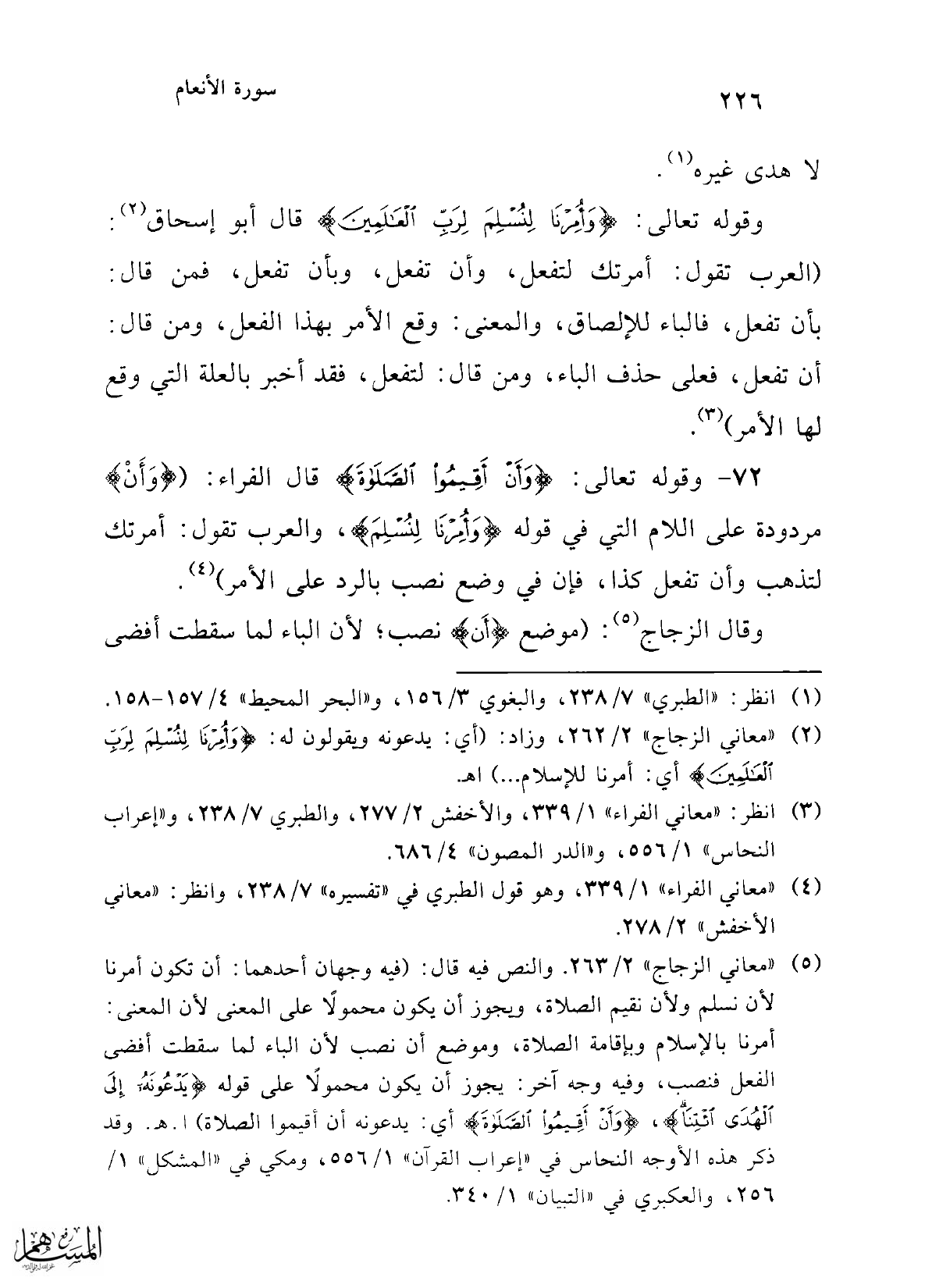 72 - وقوله تعالى: {وَأَنْ أَقِيمُوا الصَّلَاةَ} قال الفراء: ({وَأَنْ} مردودة على اللام التي في قوله {وَأُمِرْنَا لِنُسْلِمَ}، والعرب تقول: أمرتك لتذهب وأن تفعل كذا، فإن في وضع نصب بالرد على الأمر) (¬4).