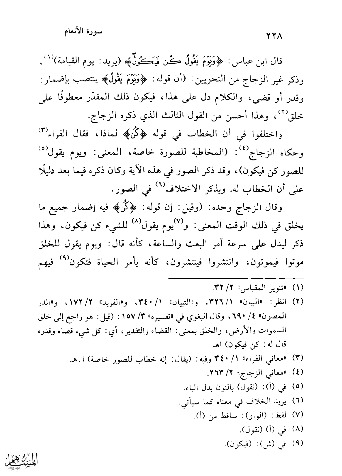 واختلفوا في أن الخطاب في قوله {كُنْ} لماذا، فقال الفراء (¬3) وحكاه الزجاج (¬4): (المخاطبة للصورة خاصة، المعنى: ويوم يقول (¬5) للصور كن فيكون)، وقد ذكر الصور في هذه الآية وكان ذكره فيما بعد دليلًا على أن الخطاب له. ويذكر الاختلاف (¬6) في الصور.