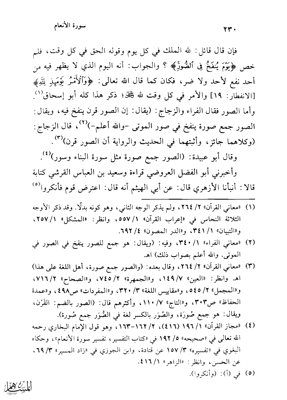 (¬2) "معاني الفراء" 1/ 340، وفيه: (ويقال: هو جمع للصور ينفخ في الصور في الموتى. والله أعلم بصواب ذلك) اهـ.
