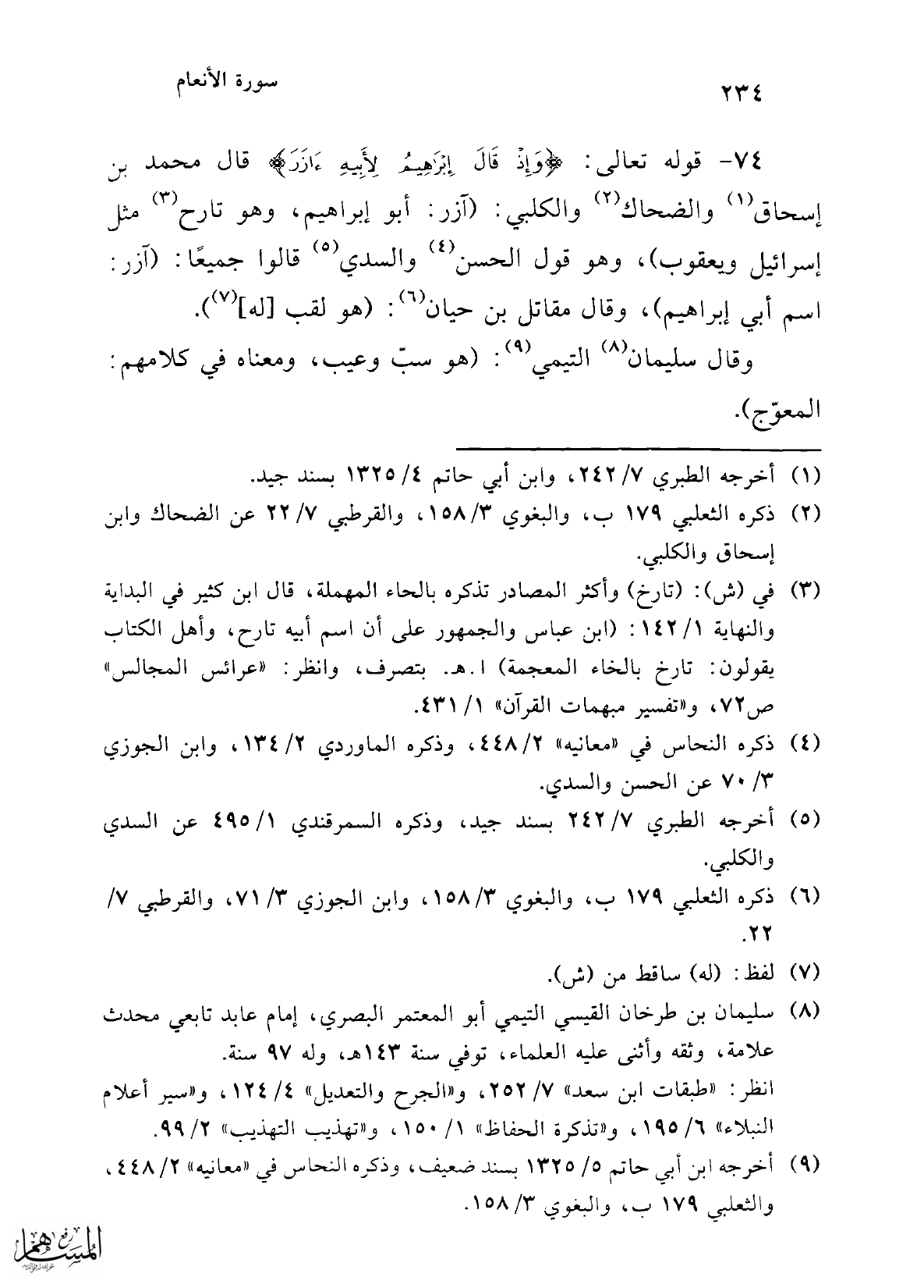 74 - قوله تعالى: {وَإِذْ قَالَ إِبْرَاهِيمُ لِأَبِيهِ آزَرَ} قال محمد بن إسحاق (¬1) والضحاك (¬2) والكلبي: (آزر: أبو إبراهيم، وهو تارح (¬3) مثل إسرائيل ويعقوب)، وهو قول الحسن (¬4) والسدي (¬5) قالوا جميعًا: (آزر: اسم أبي إبراهيم)، وقال مقاتل بن حيان (¬6): (هو لقب [له] (¬7)).