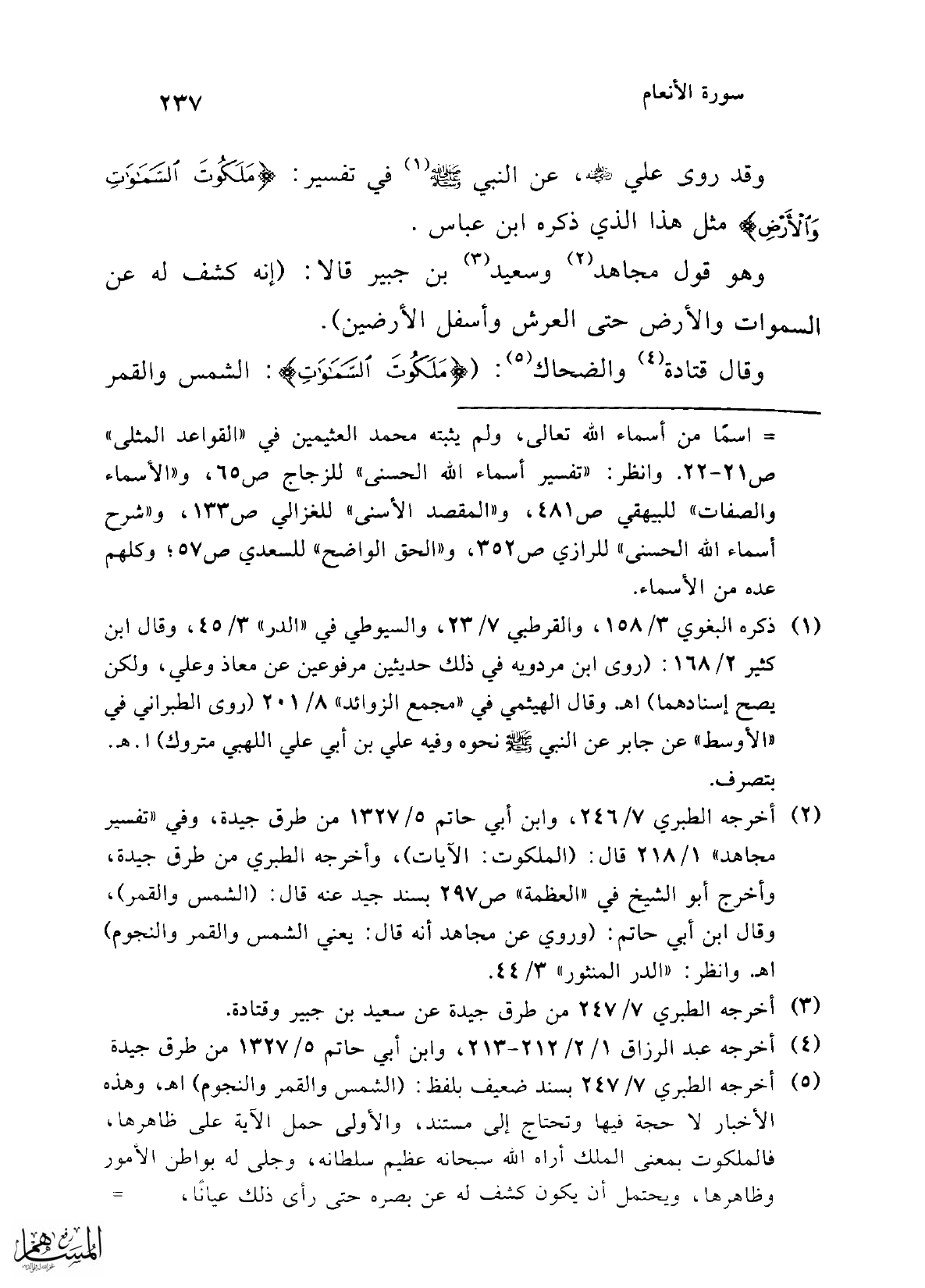 (¬2) أخرجه الطبري 7/ 246، وابن أبي حاتم 5/ 1327 من طرق جيدة، وفي "تفسير مجاهد" 1/ 218 قال: (الملكوت: الآيات)، وأخرجه الطبري من طرق جيدة، وأخرج أبو الشيخ في "العظمة" ص 297 بسند جيد عنه قال: (الشمس والقمر)، وقال ابن أبي حاتم: (وروي عن مجاهد أنه قال: يعني الشمس والقمر والنجوم) اهـ. وانظر: "الدر المنثور" 3/ 44.