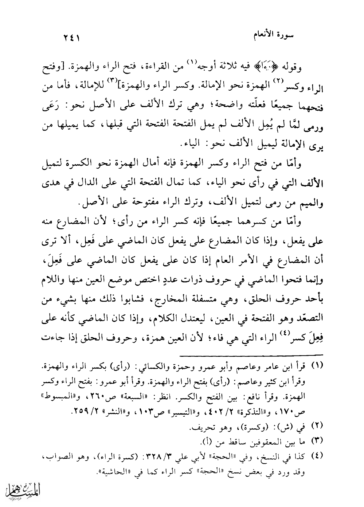 (¬4) كذا في النسخ، وفي "الحجة" لأبي علي 3/ 328: (كسرة الراء)، وهو الصواب، وقد ورد في بعض نسخ "الحجة" كسر الراء كما في "الحاشية".