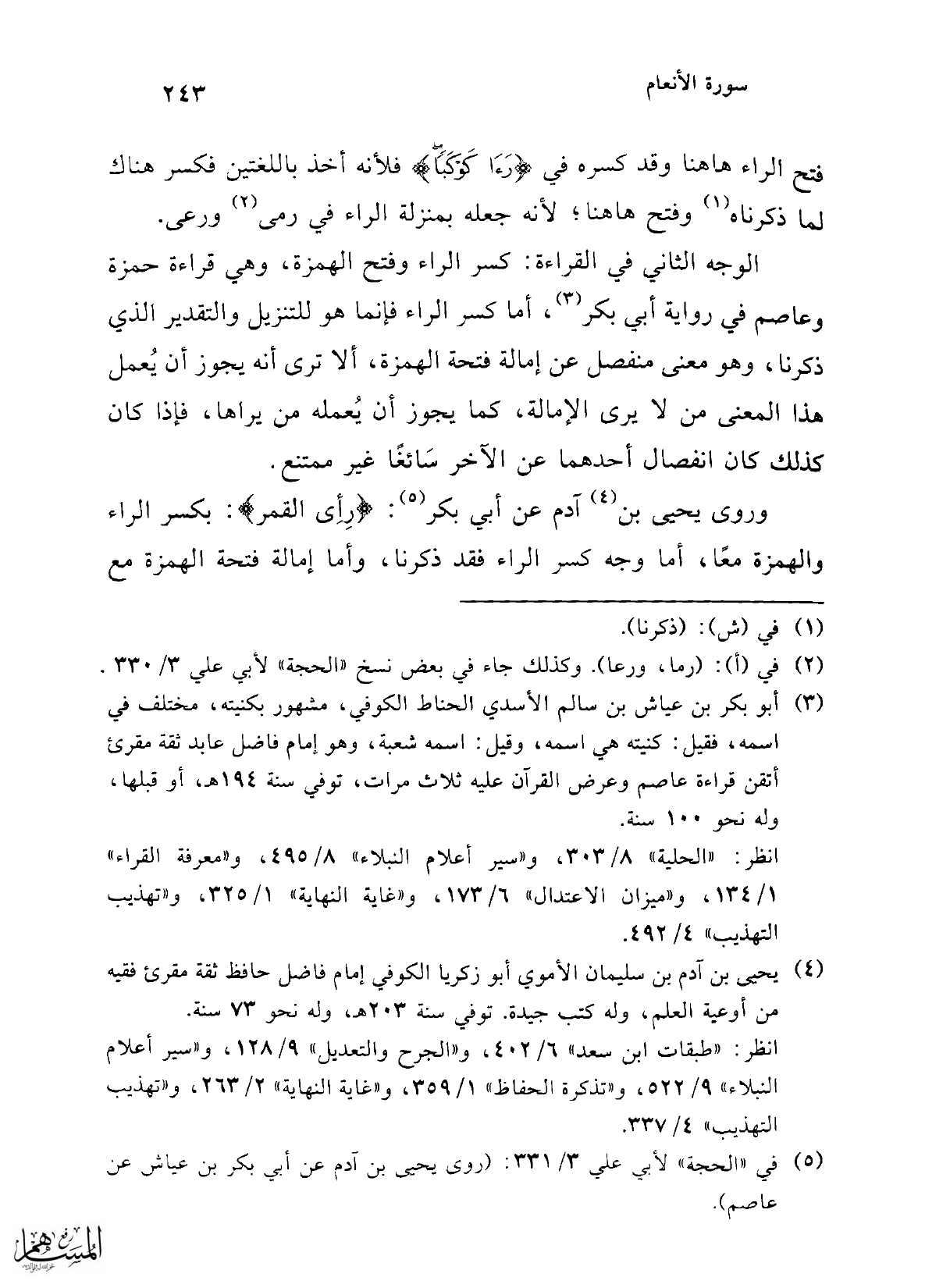 (¬5) في "الحجة" لأبي علي 3/ 331: (روى يحيى بن آدم عن أبي بكر بن عياش عن عاصم).