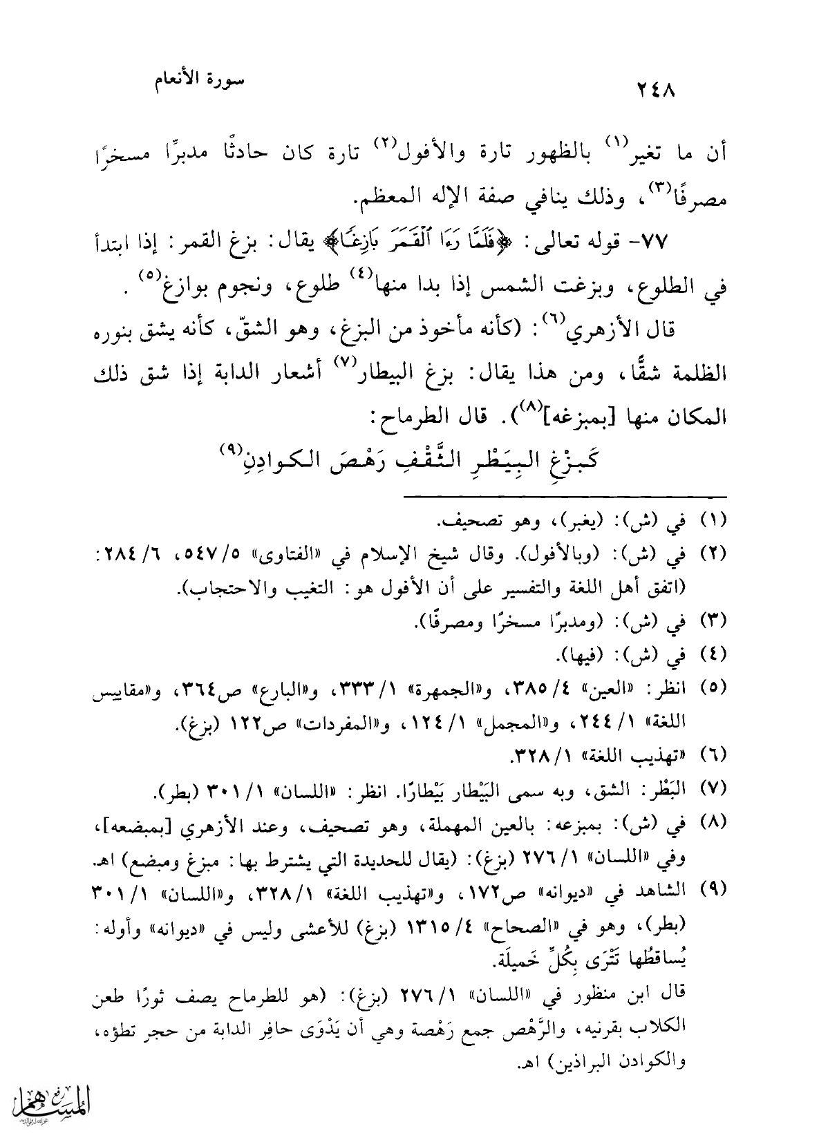 قال الأزهري (¬6): (كأنه مأخوذ من البزغ، وهو الشقّ، كأنه يشق بنوره الظلمة شقًّا، ومن هذا يقال: بزغ البيطار (¬7) أشعار الدابة إذا شق ذلك المكان منها [بمبزغه] (¬8)). قال الطرماح: