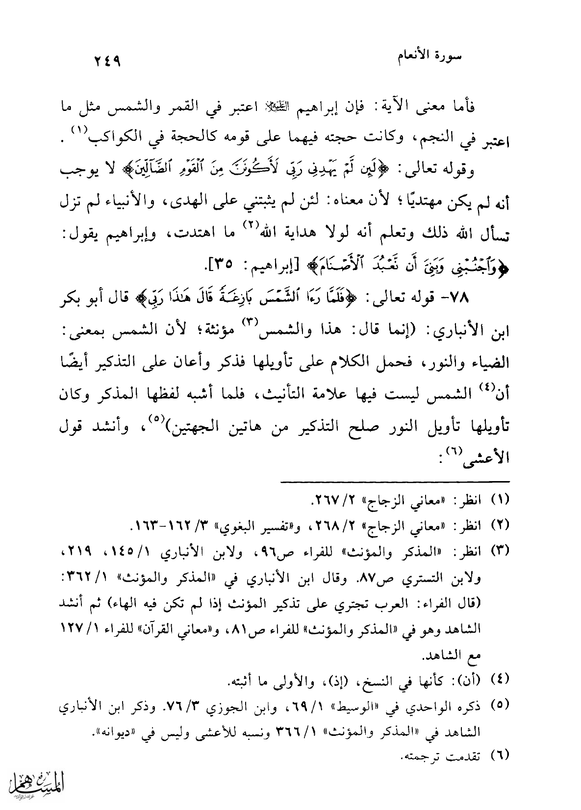 78 - قوله تعالى: {فَلَمَّا رَأَى الشَّمْسَ بَازِغَةً قَالَ هَذَا رَبِّي} قال أبو بكر ابن الأنباري: (إنما قال: هذا والشمس (¬3) مؤنثة؛ لأن الشمس بمعنى: الضياء والنور، فحمل الكلام على تأويلها فذكر وأعان على التذكير أيضًا أن (¬4) الشمس ليست فيها علامة التأنيث، فلما أشبه لفظها المذكر وكان تأويلها تأويل النور صلح التذكير من هاتين الجهتين) (¬5)، وأنشد قول الأعشى (¬6):