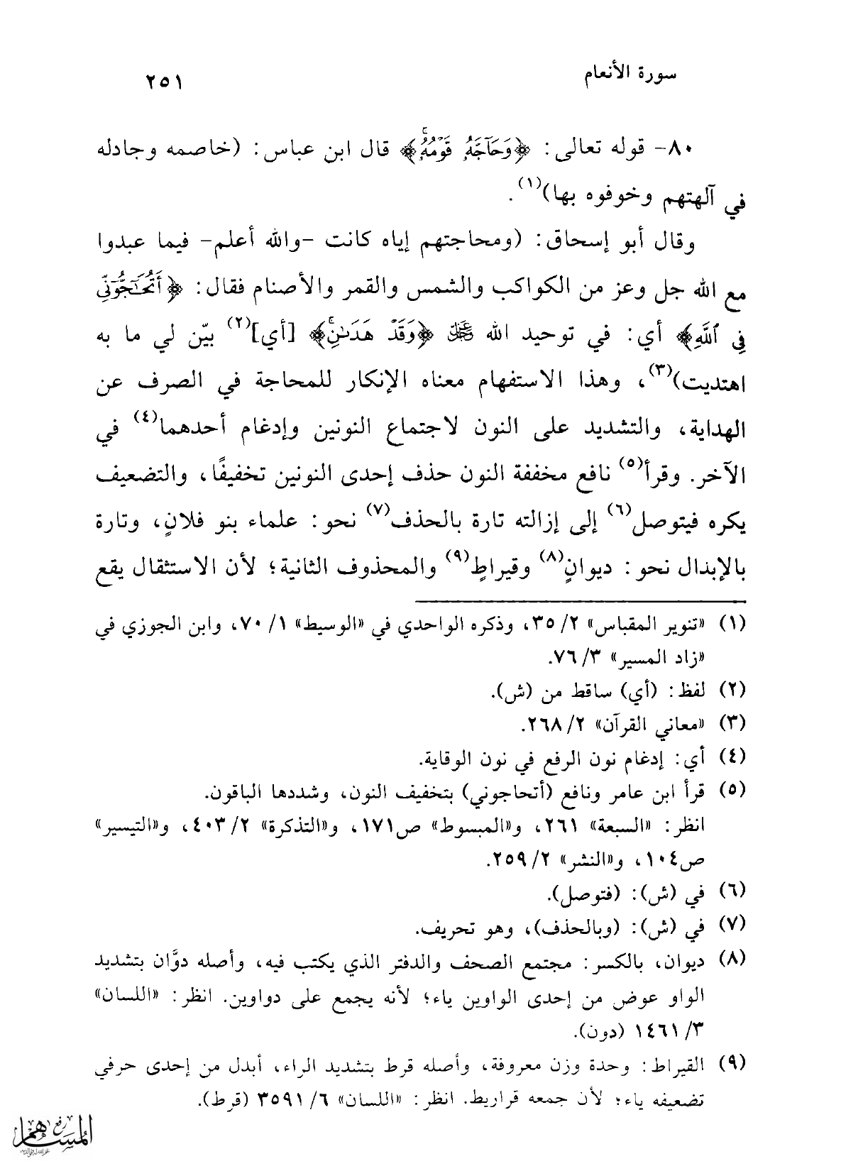 وقال أبو إسحاق: (ومحاجتهم إياه كانت -والله أعلم- فيما عبدوا مع الله جل وعز من الكواكب والشمس والقمر والأصنام فقال: {أَتُحَاجُّونِّي فِي اللَّهِ} أي: في توحيد الله عز وجل {وَقَدْ هَدَانِ} [أي] (¬2) بيّن لي ما به اهتديت) (¬3)، وهذا الاستفهام معناه الإنكار للمحاجة في الصرف عن الهداية، والتشديد على النون لاجتماع النونين وإدغام أحدهما (¬4) في الآخر. وقرأ (¬5) نافع مخففة النون حذف إحدى النونين تخفيفًا، والتضعيف يكره فيتوصل (¬6) إلى إزالته تارة بالحذف (¬7) نحو: علماء بنو فلانٍ، وتارة بالإبدال نحو: ديوانٍ (¬8) وقيراطٍ (¬9) والمحذوف الثانية؛ لأن الاستثقال يقع