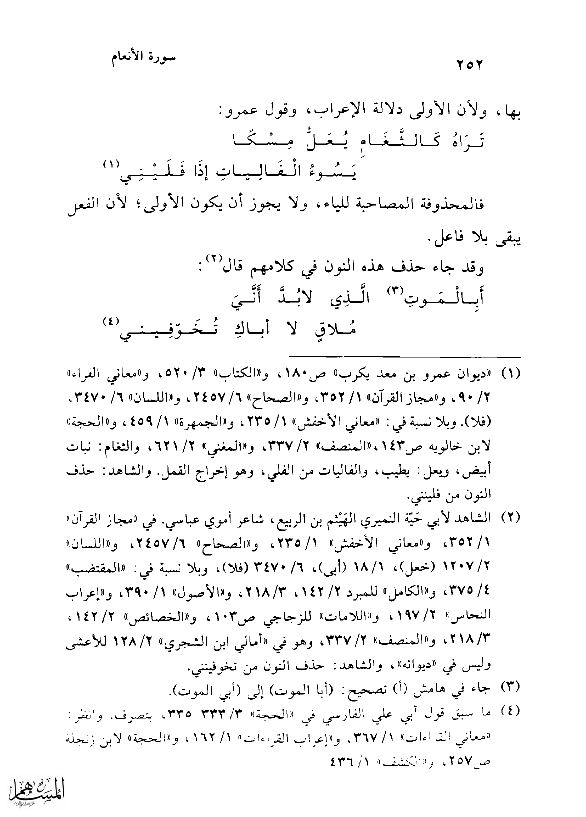 (¬2) الشاهد لأبي حَيّة النميري الهَيْثم بن الربيع، شاعر أموي عباسي. في "مجاز القرآن" 1/ 352، و"معاني الأخفش" 1/ 235، و"الصحاح" 6/ 2457، و"اللسان" 2/ 1207 (خعل)، 1/ 18 (أبى)، 6/ 3470 (فلا)، وبلا نسبة في: "المقتضب" 4/ 375، و"الكامل" للمبرد 2/ 142، 3/ 218، و"الأصول" 1/ 390، و"إعراب النحاس" 2/ 197، و"اللامات" للزجاجي ص 103، و"الخصائص" 2/ 142، 3/ 218، و"المنصف" 2/ 337، وهو في "أمالي ابن الشجري" 2/ 128 للأعشى وليس في "ديوانه"، والشاهد: حذف النون من تخوفينني.