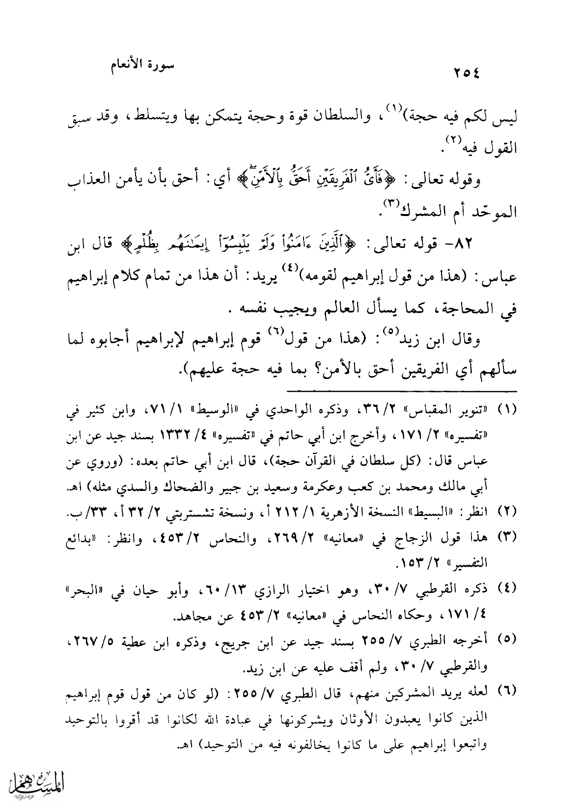 82 - قوله تعالى: {الَّذِينَ آمَنُوا وَلَمْ يَلْبِسُوا إِيمَانَهُمْ بِظُلْمٍ} قال ابن عباس: (هذا من قول إبراهيم لقومه) (¬4) يريد: أن هذا من تمام كلام إبراهيم في المحاجة، كما يسأل العالم ويجيب نفسه.