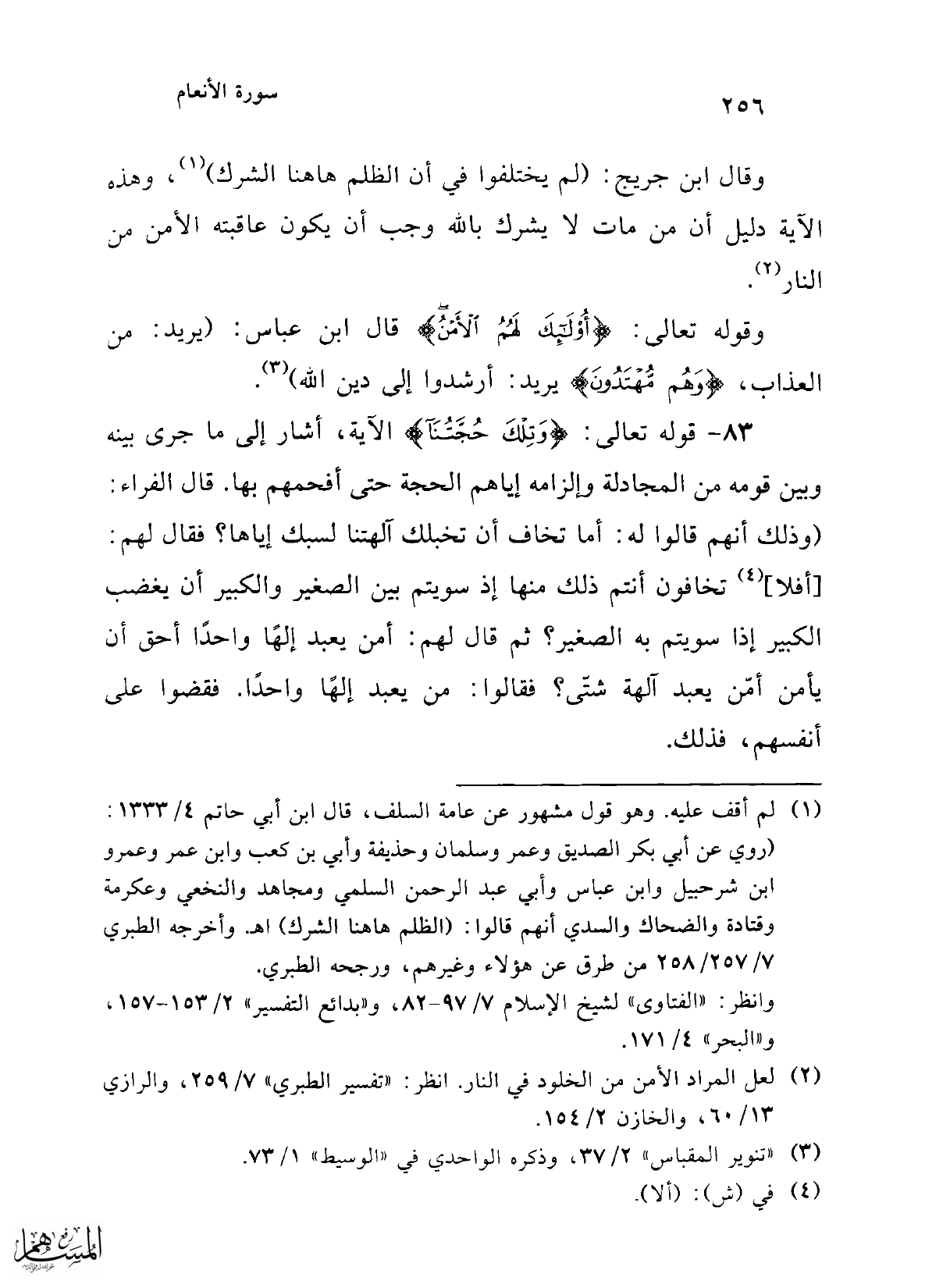 وقال ابن جريج: (لم يختلفوا في أن الظلم هاهنا الشرك) (¬1)، وهذه الآية دليل أن من مات لا يشرك بالله وجب أن يكون عاقبته الأمن من النار (¬2).