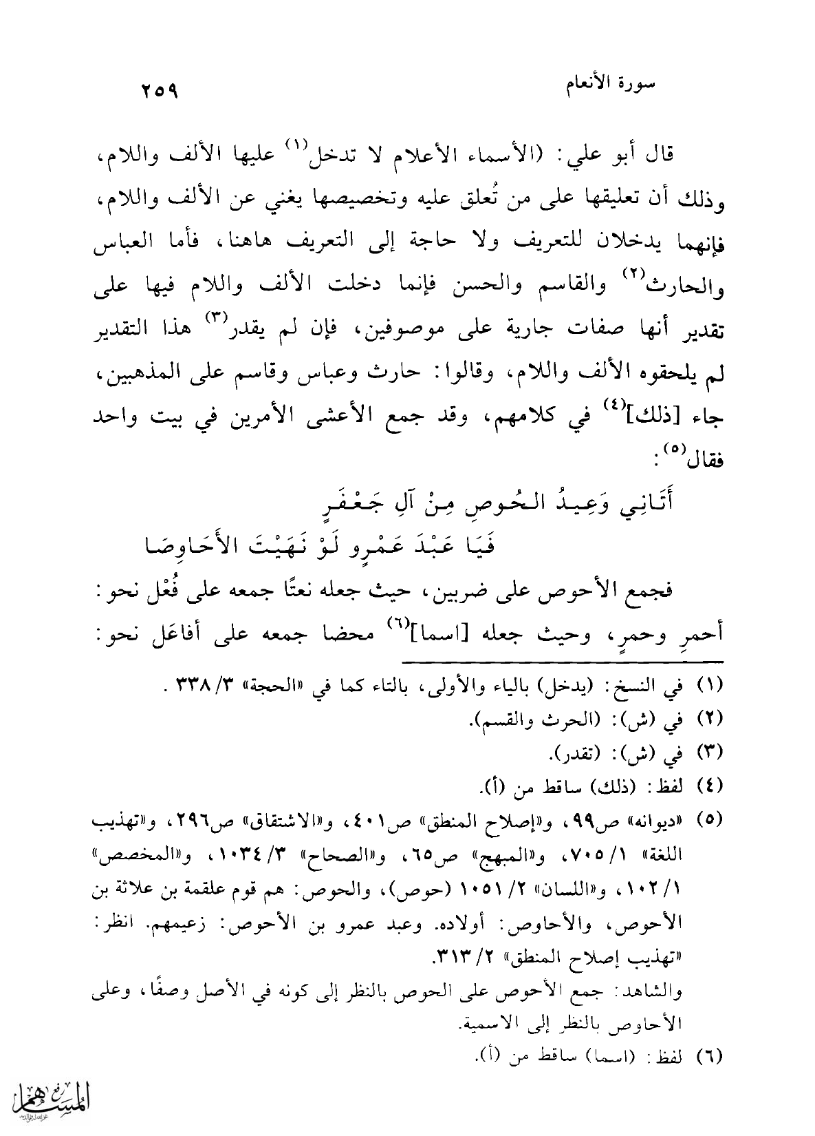 قال أبو علي: (الأسماء الأعلام لا تدخل (¬1) عليها الألف واللام، وذلك أن تعليقها على من تُعلق عليه وتخصيصها يغني عن الألف واللام، فإنهما يدخلان للتعريف ولا حاجة إلى التعريف هاهنا، فأما العباس والحارث (¬2) والقاسم والحسن فإنما دخلت الألف واللام فيها على تقدير أنها صفات جارية على موصوفين، فإن لم يقدر (¬3) هذا التقدير لم يلحقوه الألف واللام، وقالوا: حارث وعباس وقاسم على المذهبين، جاء [ذلك] (¬4) في كلامهم، وقد جمع الأعشى الأمرين في بيت واحد فقال (¬5):