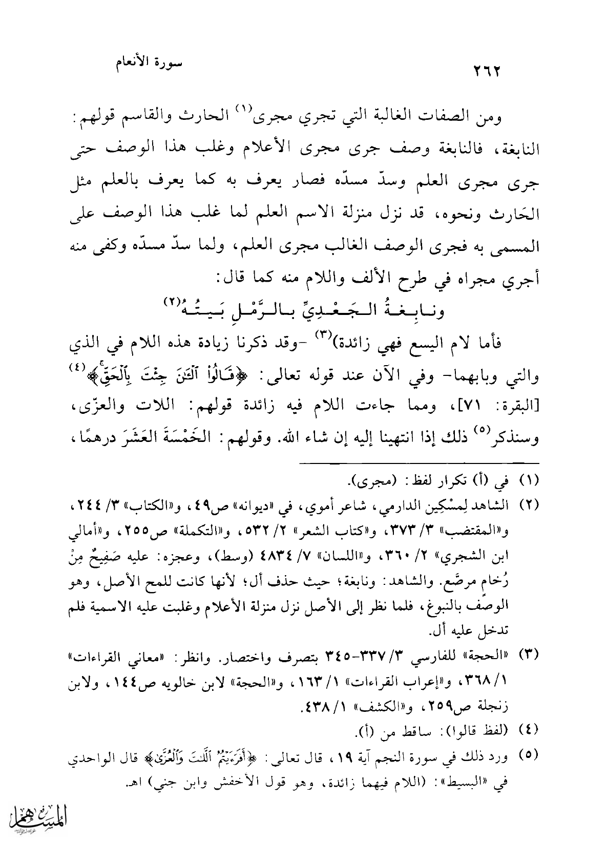 (¬2) الشاهد لِمسْكِين الدارمي، شاعر أموي، في "ديوانه" ص 49، و"الكتاب" 3/ 244، و"المقتضب" 3/ 373، و"كتاب الشعر" 2/ 532، و"التكملة" ص 255، و"أمالي ابن الشجري" 2/ 360، و"اللسان" 7/ 4834 (وسط)، وعجزه: عليه صَفِيحٌ مِنْ رُخامٍ مرصَّع. والشاهد: ونابغة؛ حيث حذف أل؛ لأنها كانت للمح الأصل، وهو الوصف بالنبوغ، فلما نظر إلى الأصل نزل منزلة الأعلام وغلبت عليه الاسمية فلم تدخل عليه أل.