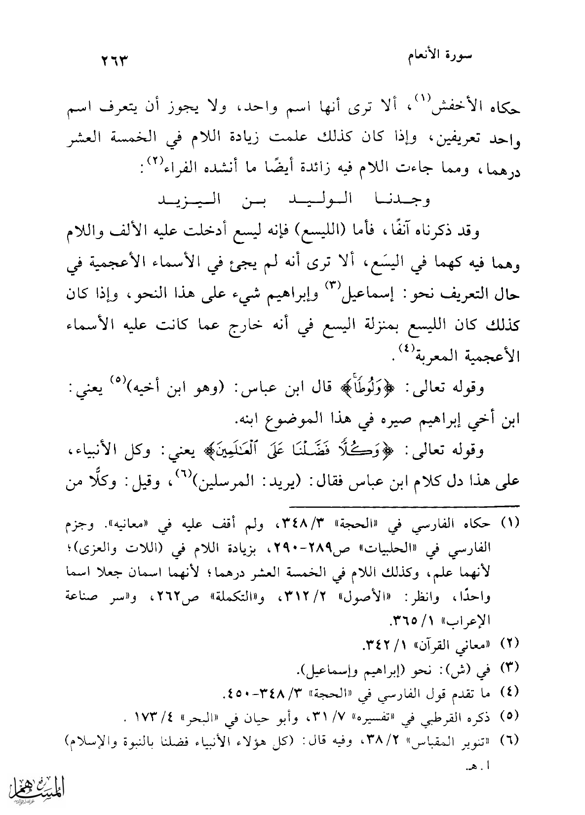 وقد ذكرناه آنفًا، فأما (الليسع) فإنه ليسع أدخلت عليه الألف واللام وهما فيه كهما في اليسَع، ألا ترى أنه لم يجيء في الأسماء الأعجمية في حال التعريف نحو: إسماعيل (¬3) وإبراهيم شيء على هذا النحو، وإذا كان كذلك كان الليسع بمنزلة اليسع في أنه خارج عما كانت عليه الأسماء الأعجمية المعربة (¬4).