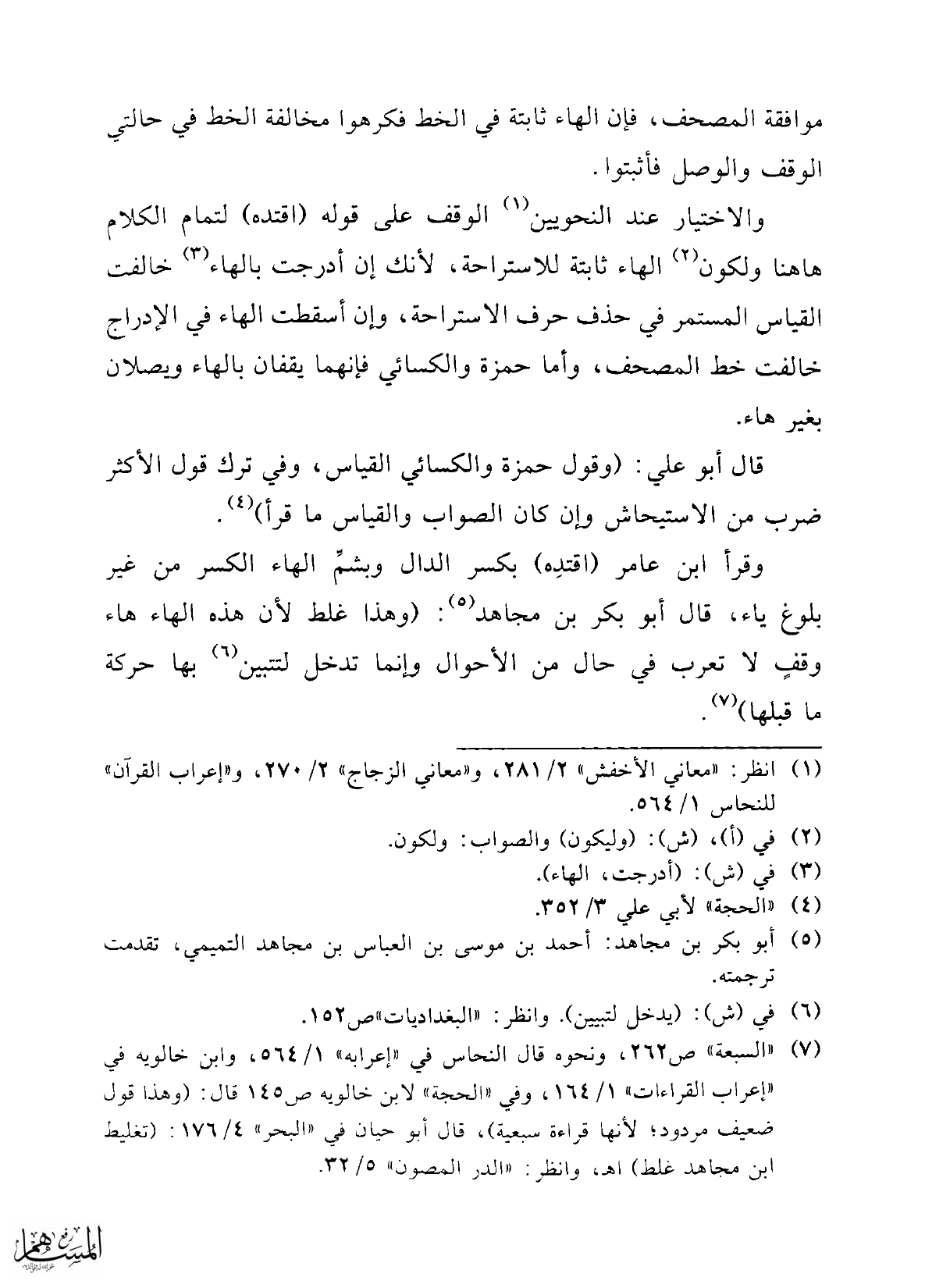 والاختيار عند النحويين (¬1) الوقف على قوله (اقتده) لتمام الكلام هاهنا ولكون (¬2) الهاء ثابتة للاستراحة؛ لأنك إن أدرجت بالهاء (¬3) خالفت القياس المستمر في حذف حرف الاستراحة، وإن أسقطت الهاء في الإدراج خالفت خط المصحف، وأما حمزة والكسائي فإنهما يقفان بالهاء ويصلان بغير هاء.