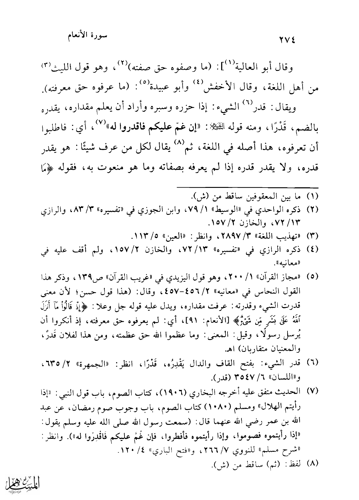 ويقال: قدر (¬6) الشيء: إذا حزره وسبره وأراد أن يعلم مقداره، يقدره بالضم، قَدْرًا، ومنه قوله عليه السلام: " إن غمّ عليكم فاقدروا له" (¬7)، أي: فاطلبوا أن تعرفوه، هذا أصله في اللغة، ثم (¬8) يقال لكل من عرف شيئًا: هو يقدر قدره، ولا يقدر قدره إذا لم يعرفه بصفاته وما هو منعوت به، فقوله {مَا