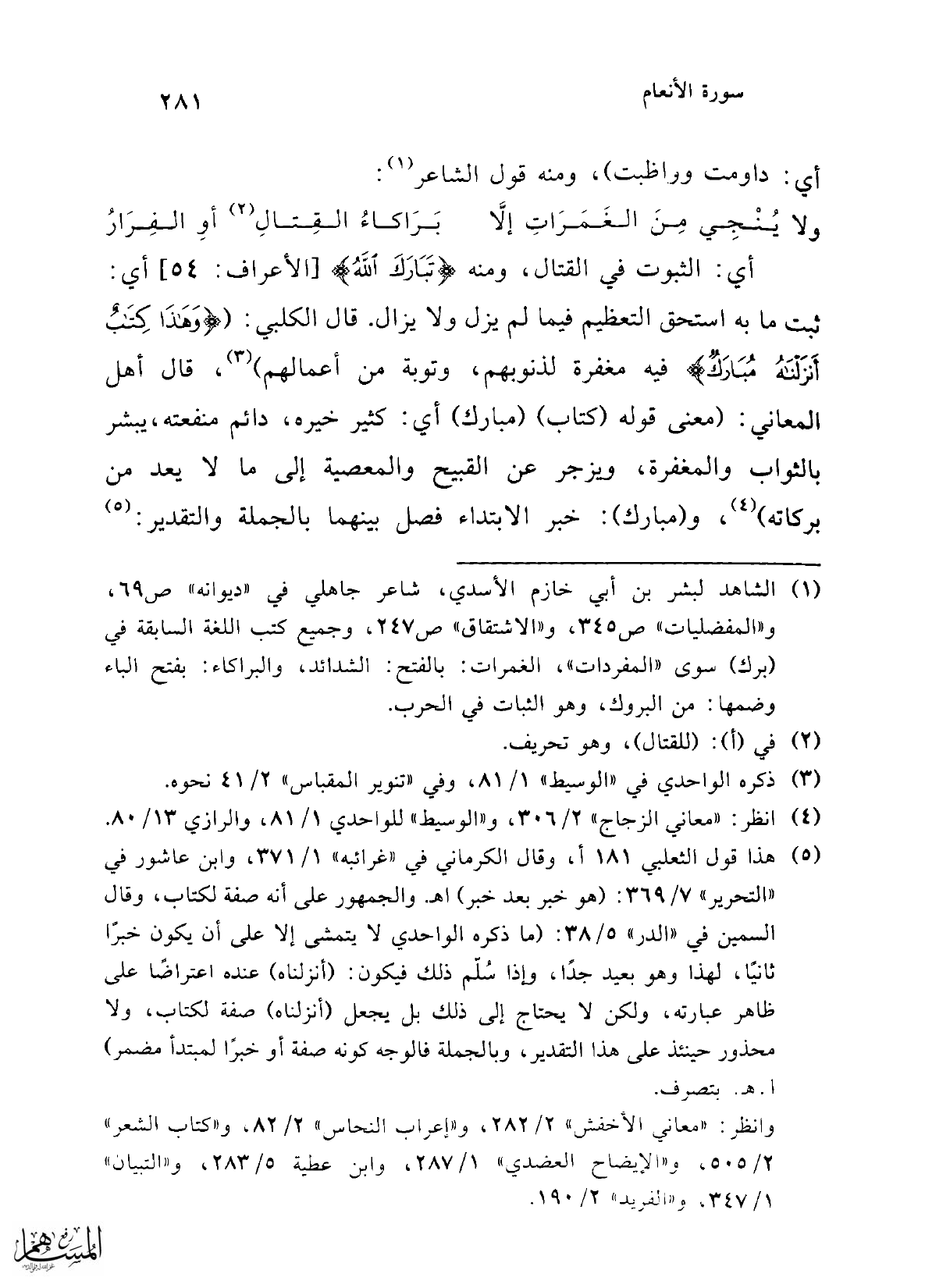 أي: الثبوت في القتال، ومنه {تَبَارَكَ اللَّهُ} [الأعراف: 54] أي: ثبت مما به استحق التعظيم فيما لم يزل ولا يزال. قال الكلبي: ({وَهَذَا كِتَابٌ أَنْزَلْنَاهُ مُبَارَكٌ} فيه مغفرة لذنوبهم، وتوبة من أعمالهم) (¬3)، قال أهل المعاني: (معنى قوله (كتاب) (مبارك) أي: كثير خيره، دائم منفعته، يبشر بالثواب والمغفرة، ويزجر عن القبيح والمعصية إلى ما لا يعد من بركاته) (¬4)، و (مبارك): خبر الابتداء فصل بينهما بالجملة والتقدير: (¬5)
