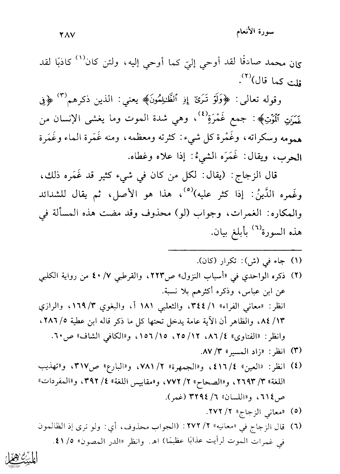 وقوله تعالى: {وَلَوْ تَرَى إِذِ الظَّالِمُونَ} يعني: الذين ذكرهم (¬3) {فِي غَمَرَاتِ الْمَوْتِ}: جمع غَمْرَةٍ (¬4)، وهي شدة الموت وما يغشى الإنسان من همومه وسكراته، وغَمْرة كل شيء: كثرته ومعظمه، ومنه غَمَرة الماء وغَمَرة الحرب، ويقال: غَمَرَه الشيءُ: إذا علاه وغطاه.