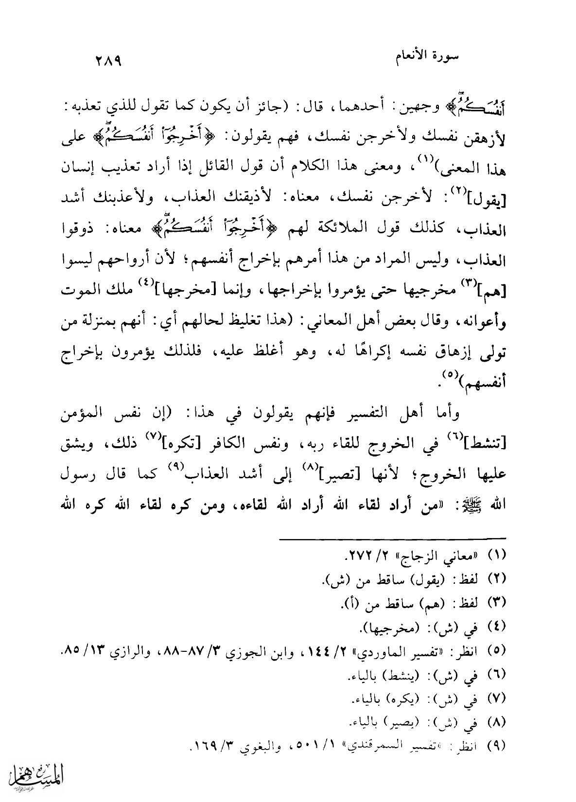 وأما أهل التفسير فإنهم يقولون في هذا: (إن نفس المؤمن [تنشط] (¬6) في الخروج للقاء ربه، ونفس الكافر [تكره] (¬7) ذلك، ويشق عليها الخروج؛ لأنها [تصير] (¬8) إلى أشد العذاب (¬9) كما قال رسول الله - صلى الله عليه وسلم -: "من أراد لقاء الله أراد الله لقاءه، ومن كره لقاء الله كره الله
