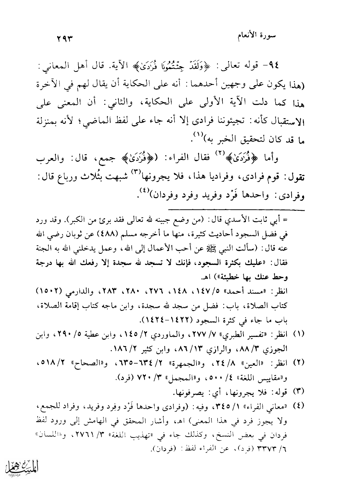 (¬4) "معاني الفراء" 1/ 345، وفيه: (وفرادى واحدها فَرْد وفِرد وفريد، وفراد للجمع، ولا يجوز فرد في هذا المعنى) اهـ , وأشار المحقق في الهامش إلى ورود لفظ فردان في بعض النسخ, كذلك جاء في "تهذيب اللغة" 3/ 2761، و"اللسان" 6/ 3373 (فرد) , عن الفراء لفظ (فردان).