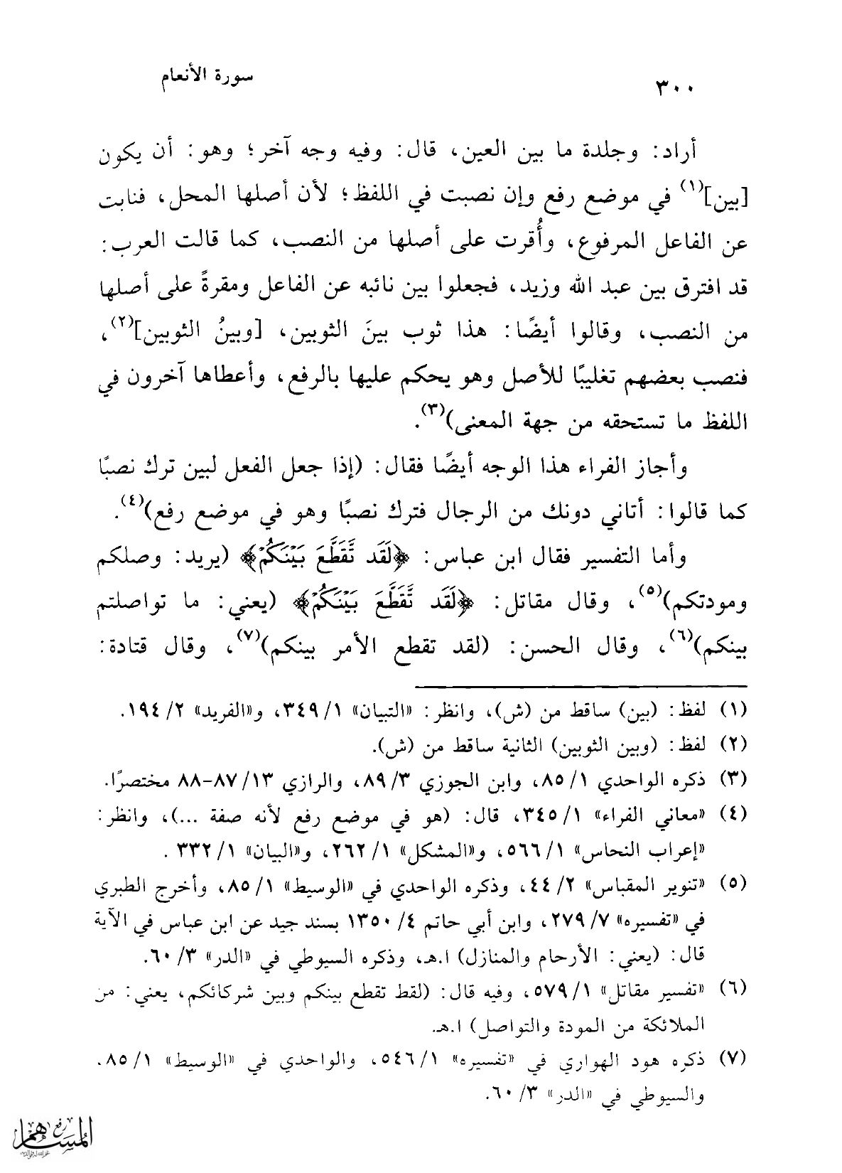 (¬6) "تفسير مقاتل" 1/ 579، وفيه قال: (لقط تقطع بينكم وبين شركائكم، يعني: من الملائكة من المودة والتواصل) ا. هـ.